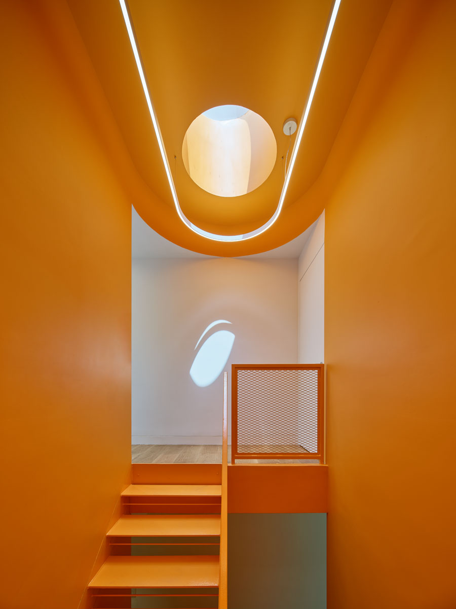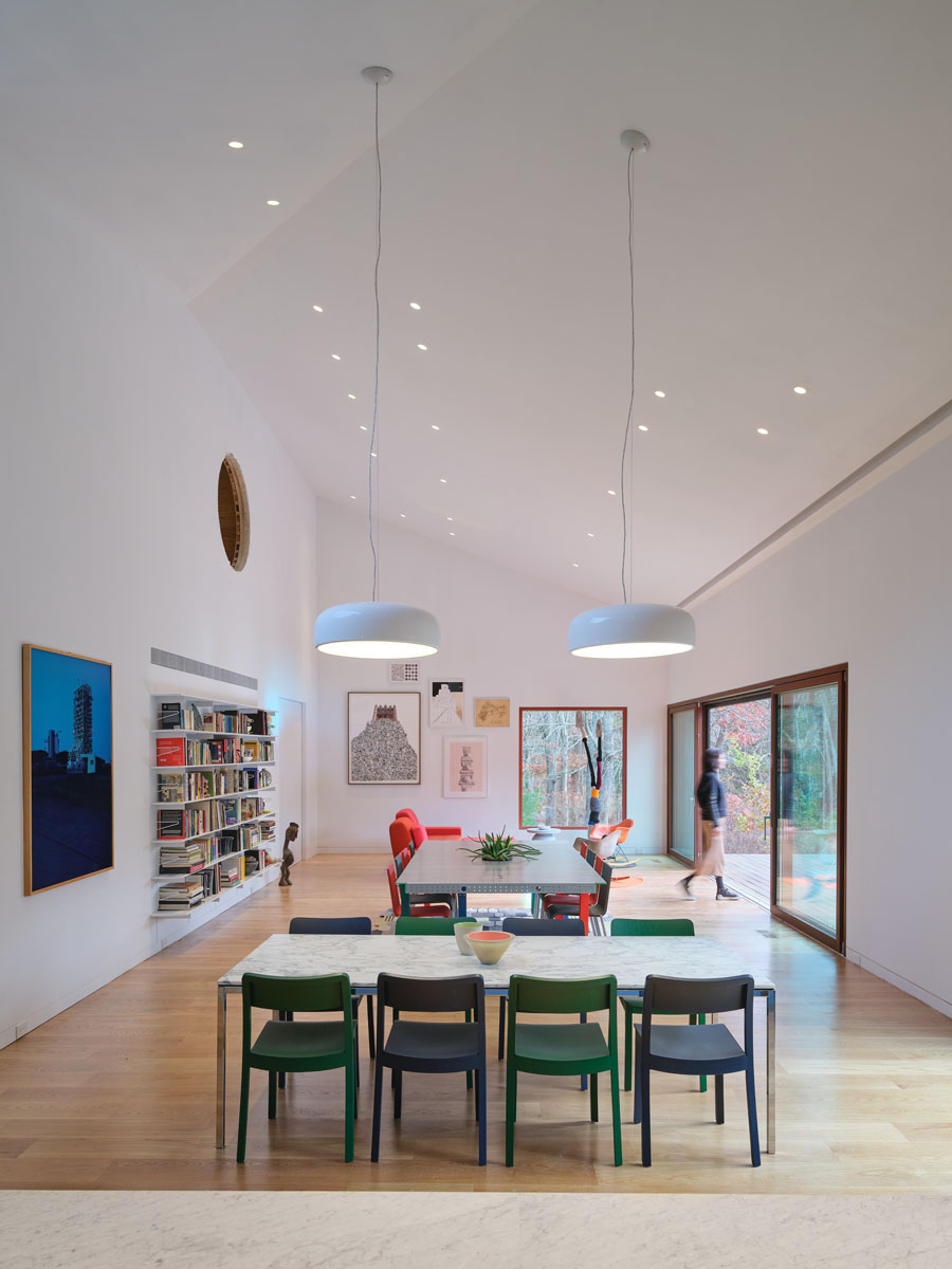 River house는 팬데믹 이후 농촌으로 이동한 주거 양상을 반영한 주택이다. WORKac는 로드아일랜드의 한 숲속, 파우카턱강(Pawcatuck River)을 따라 형성된 강변 부지에 어울리는 넷제로 패시브하우스 겸 스튜디오를 기획하였다. 지속 가능한 주택을 위한 제로 에너지 디자인의 주택으로, 대형 개구부가 데크 방향으로 완전히 열리는 공간디자인이 채택되었다. 상부 레벨에는 지붕을 비워 낸 루프 데크를 활용하였고, 이 개구부를 통해 전달되는 빛은 수직적 공간 흐름을 완성한다. 더불어 목기반 단열재를 적극적으로 사용해 환경 영향을 최소화하는 자족형 주거 작업 공간을 연출하였다. 숲과 강에 둘러싸인 River house는 닫힌 건축이라는 패시브 하우스의 선입견을 넘어 고성능 저 에너지 구조 안에서도 충분히 개방적이고, 풍경을 수용하는 삶의 가능성을 보여준 결과물이다.