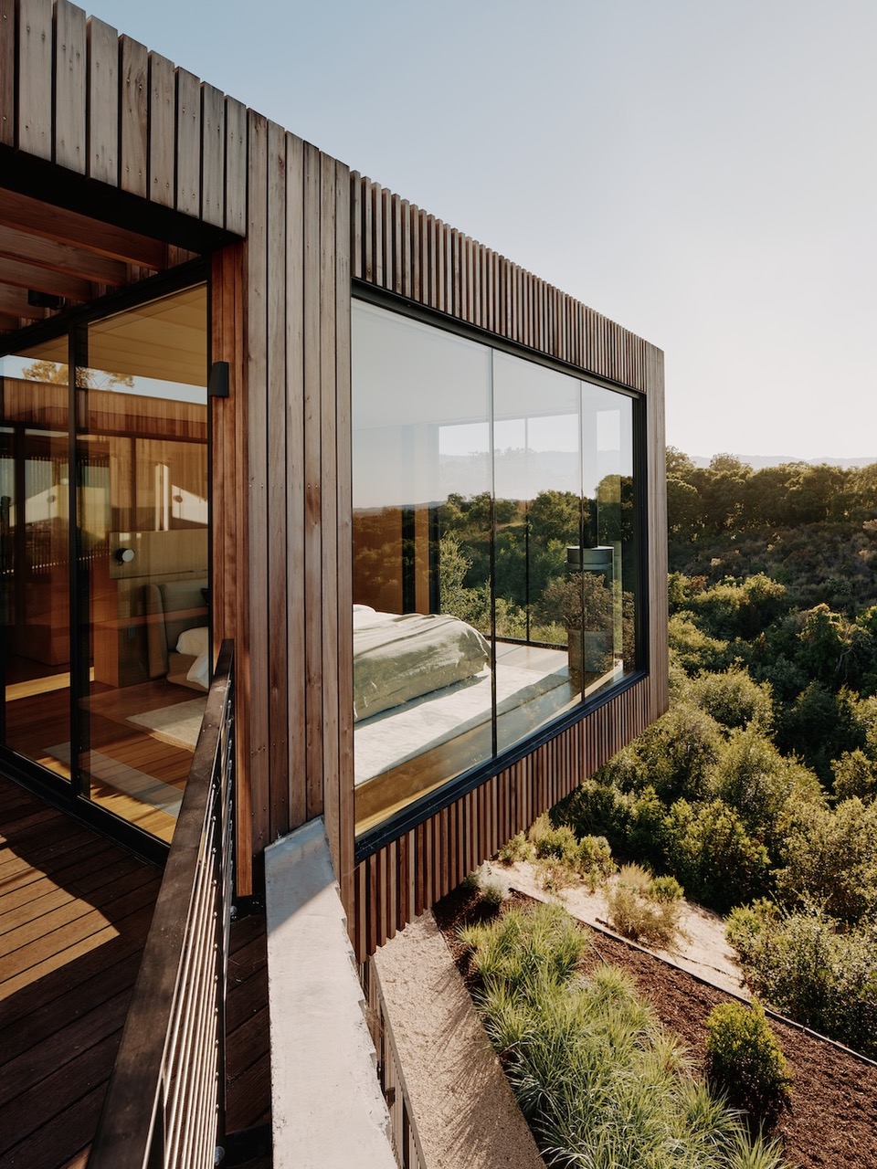 The primary suites on the upper level extend across the slope on cantilevered volumes, quietly hovering above the landscape. Set on a 12,500 m² site, the house offers panoramic views stretching from the adjacent Stanford University campus to the expanse of San Francisco Bay. The residence achieves a balance between its expansive presence and moments of calm and enclosure. Nestled beneath oaks, the guest house expands more intimately upward toward the bay through its canopy, enhancing the spatial layering of the interiors.