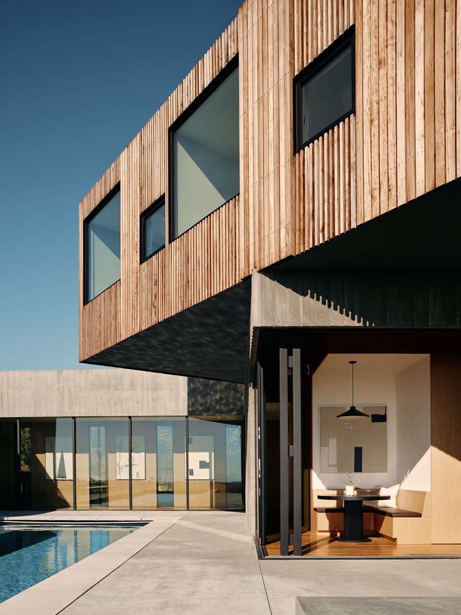 2025년 봄 완공된 주택 'Moksha'는 미국 캘리포니아 포톨라 밸리에 자리한다. 건축물은 특정 장소에 시간이 지남에 따라 거주하는 층층이 쌓인 물질적 조건과 그 너머로 확장되는 것들을 중심으로 사색적인 틀을 설정한다. 견고한 1층 콘크리트 벽과 재생 목재 사이딩(외장재), 비 가림막은 상부 매스를 연결하고 주변 맥락과 조화를 이룬다. 메인 하우스와 게스트 하우스로 구성된 건물은 직교하는 기하학적 구조가 회전해 안뜰과 시야를 형성하고, 조각적 소재와 주위 풍경의 조합은 시각적 절정을 이룬다.