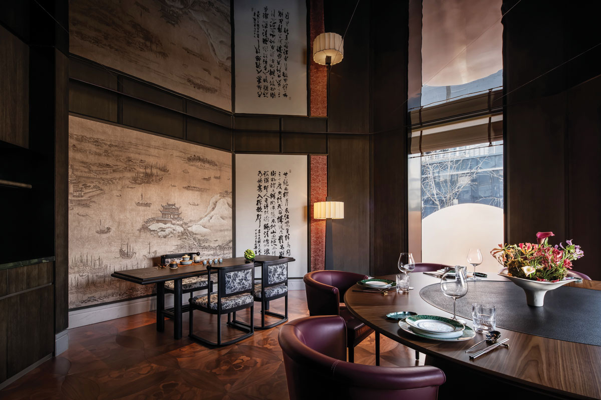 LDH 디자인은 전통적인 코트야드(courtyard) 개념을 실내에 재해석해 도입하며, 층위를 강조하는 순차적인 공간 구성을 완성하였다. 1층은 밝고 개방적인 분위기로 설계되어 메인 홀의 중심 역할을 수행하고, 붉은 옥빛의 원형 계단을 따라 올라가는 2층은 친밀함과 개방감이 공존하는 반 프라이빗 다이닝 존으로 이어진다. 대칭적인 레이아웃과 원형 계단은 방문객이 외부에서 중간 영역을 거쳐 내부로 자연스럽게 이동하도록 유도하며, 공간의 흐름에 명확한 질서를 부여한다.
