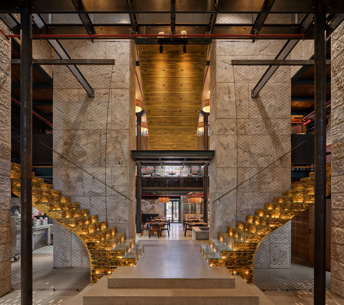©BoysPlayNiceMexická는 중앙아메리카의 요리와 문화를 경험할 수 있는 기념비적 공간을 프라하에 구현한 프로젝트다. 20–20–ARCHITEKTI는 과거 홀레쇼비체(Holašovice) 양조장의 높은 공간에 중앙 중정을 중심으로 한 2층의 갤러리 구조를 공간에 투영시켰다. 여기에 금빛 조명의 다중 팔형 계단을 디자인하였고, 오픈 키친과 대형 화덕, 그리고 활기찬 멕시코 하시엔다(hacienda)의 분위기를 결합해 레스토랑을 완성하였다. Mexická의 중심 조형물인 계단은 워크어블 글라스(Walkable glass)로 연결되어 있으며, 블랙 스틸 메쉬 난간은 전체적인 개방감을 더한다. 각 계단은 정밀 가공된 목재 보드를 결합해 설계하였고, 금빛 입자가 섞인 에폭시 레진을 활용해 완성하였다.