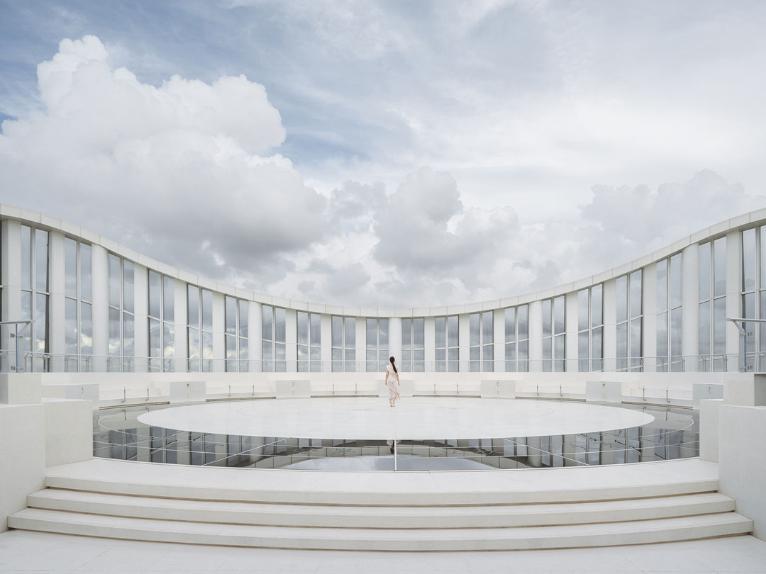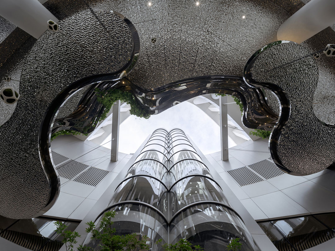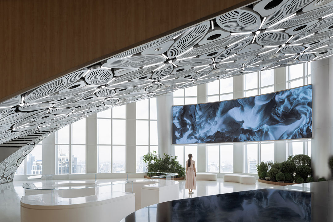 Using a sequence of white arches, the architect shapes Level 56—dominated by smaller rooms—into a continuous iceberg-like cavern, while Level 55 introduces a double-height observation café and convention hall to enrich the spatial composition. To prevent monotony, building systems such as lighting, sprinklers, speakers, and ventilation are integrated into a single pattern through computational patterning.