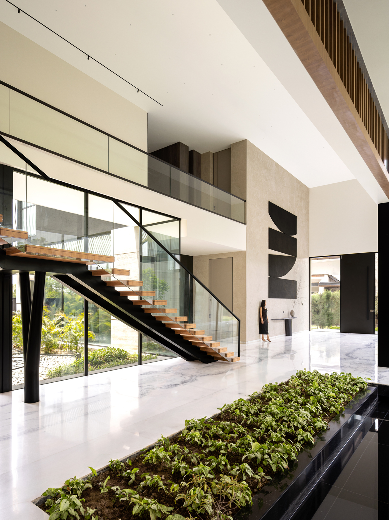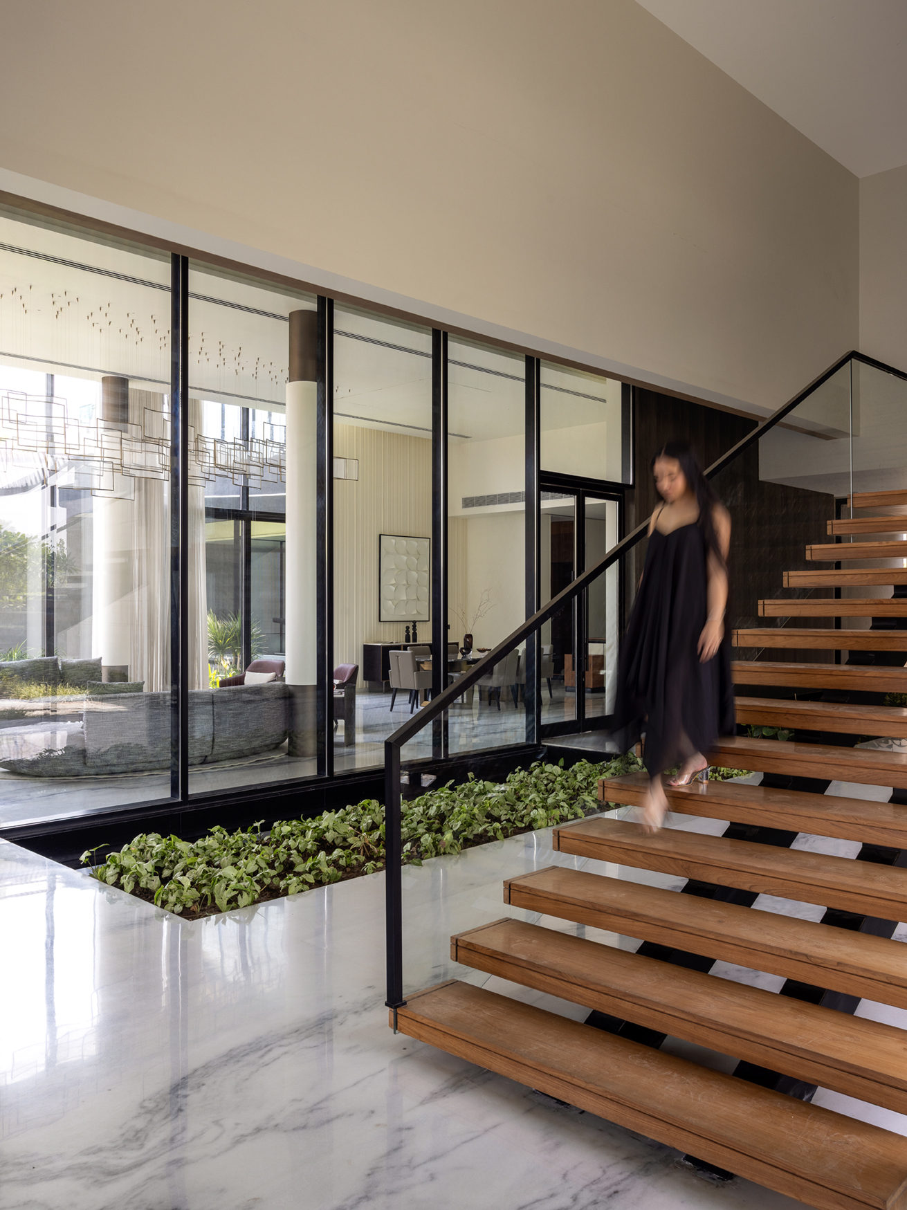A gently cur ved par tition sof tly defines the boundary between the formal living area and the more relaxed family living and dining zones. While the formal living space is designed for hosting guests in a refined setting, the family living and dining areas encourage casual interaction, shared meals, and the ever yday rituals that bring people together. The kitchen, positioned conveniently nearby, allows easy access for serving and socializing, yet its design keeps it visually understated so it doesn’t dominate the space. All these areas are thoughtfully connected, forming a central “social spine” within the home. On pleasant days, the boundaries bet ween indoors and outdoors almost disappear, extending the living experience into the natural landscape and making the garden an integral part of daily life.