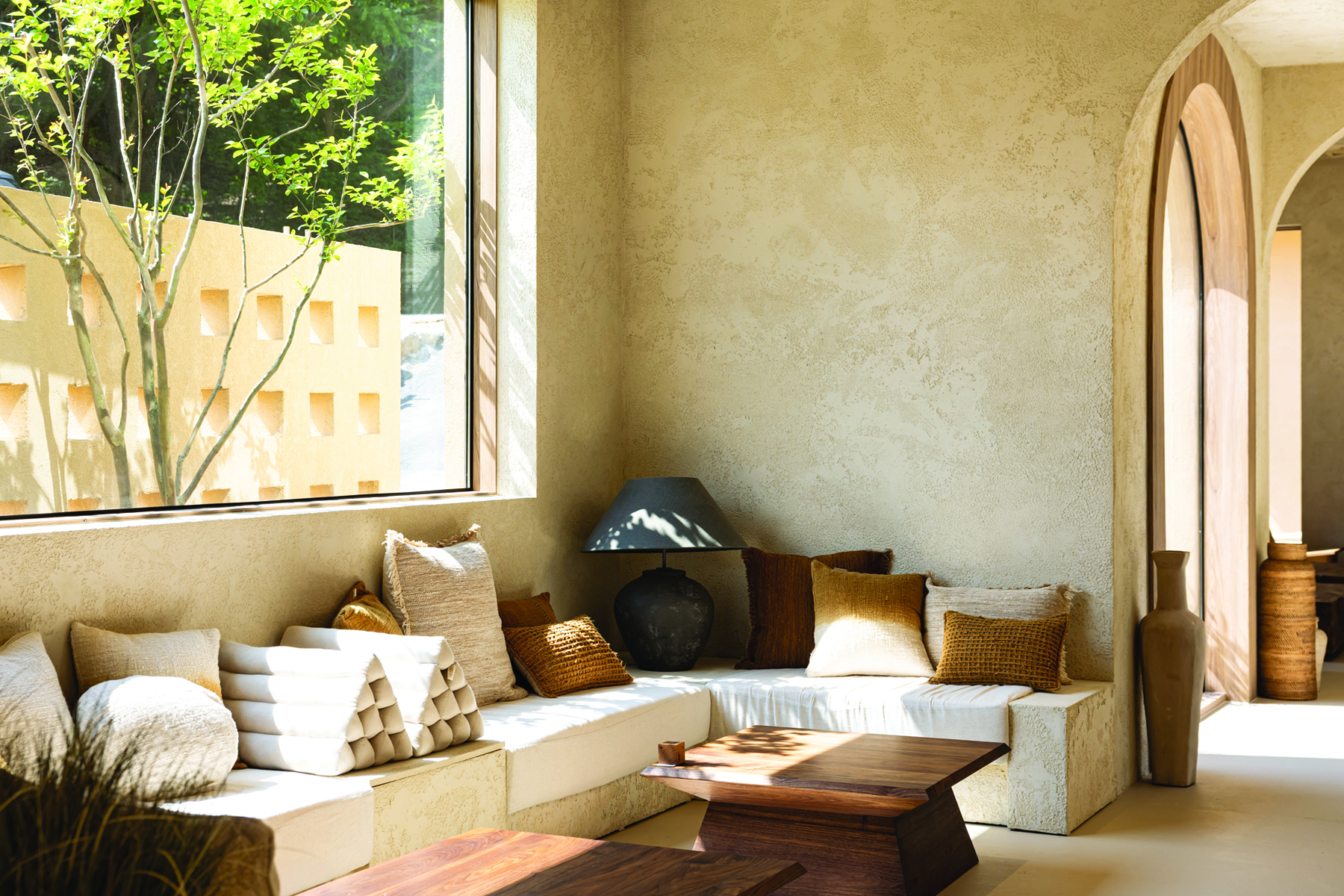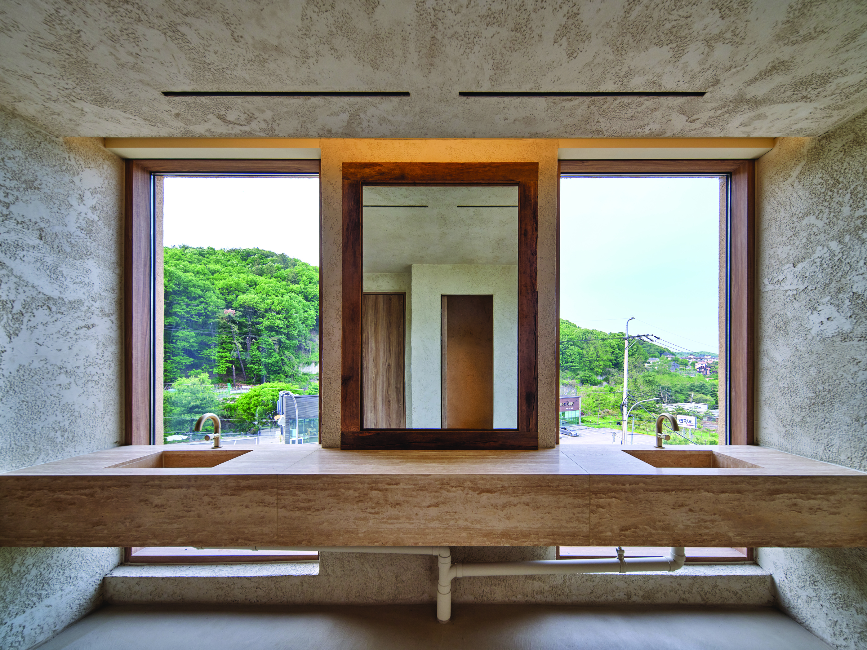 그리스어 ‘mazi(함께)’와 ‘mou(나 자신)’의 합성어인 마지모우(MAZIMOU)는 그 의미처럼 ‘함께이면서도 나답게 머무는 공간’을 지향한다. 박재인, 장택근 두 대표가 사막의 작은 마을에서 영감을 받아 기획한 마지모우는 외부의 소음과 일상의 흐름에서 벗어나 진정한 쉼과 감정의 전환을 경험할 수 있는 공간으로 설계되었다. 건물은 갤러리동, 웜홀동, 브릿지동, 카페동 등 총 4개의 공간으로 나뉘며, 중앙 광장을 향해 열린 구조로 배치되어 있다. 1층 카페동에 들어서면 높은 층고와 이국적인 인테리어가 시선을 사로잡는다. 곳곳에 묵직한 월넛 톤의 배색이 공간을 세련되게 잡아준다. 2층 세면 공간에서는 탁 트인 전면의 조망이 그림처럼 펼쳐진다.