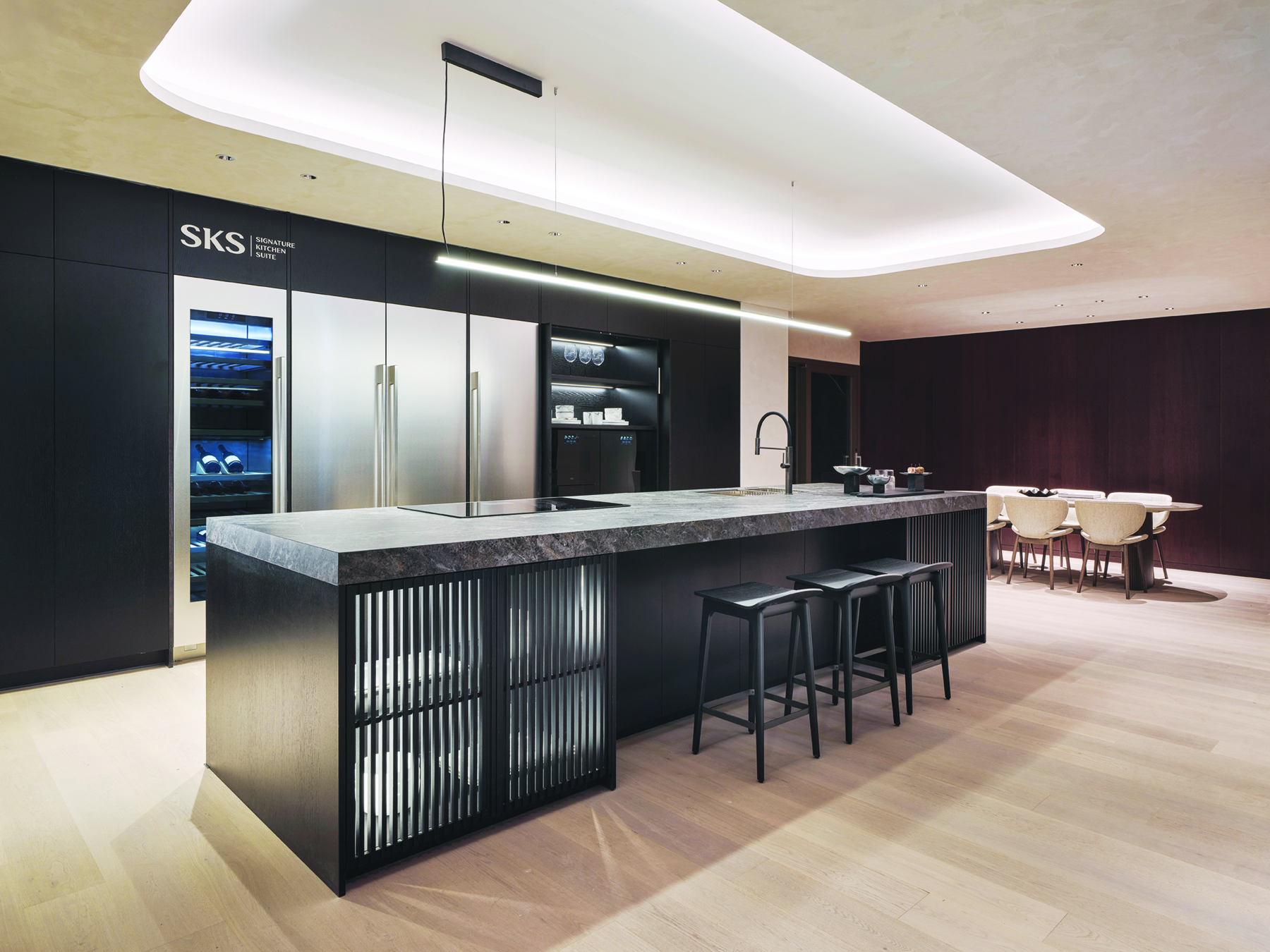 로비를 지나 3층으로 올라가면, SKS Seoul의 핵심 프리미엄 라인인 빌트인 제품 쇼룸이 구현되어 있다. 풀 라인업이 한자리에 구성된 이곳에는, 이탈리아 하이엔드 가구 아크리니아(Arclinea)가 배치되어 유럽 특유의 감성과 섬세함이 더해졌다. 넥서스 키친의 매트한 질감은 공간의 품격을 부드럽지만 힘 있게 끌어올린다.