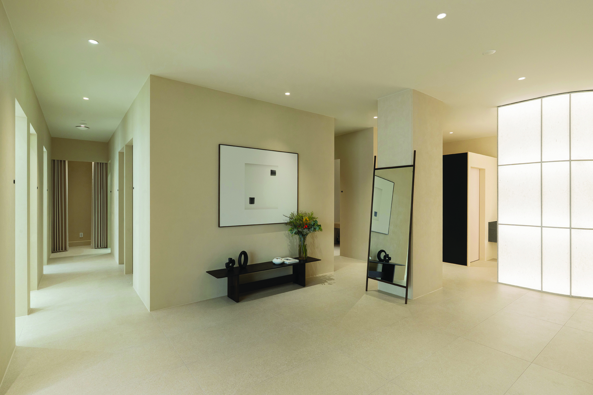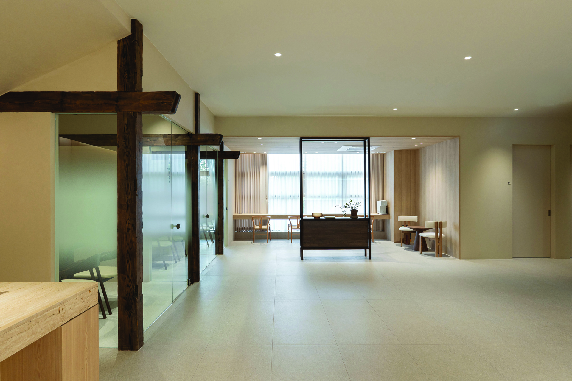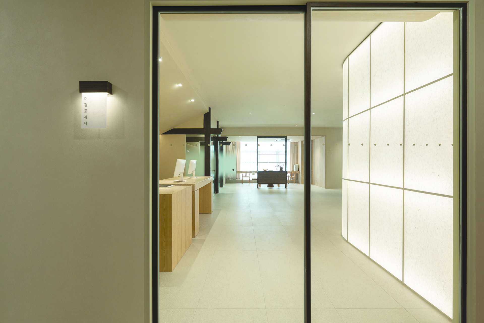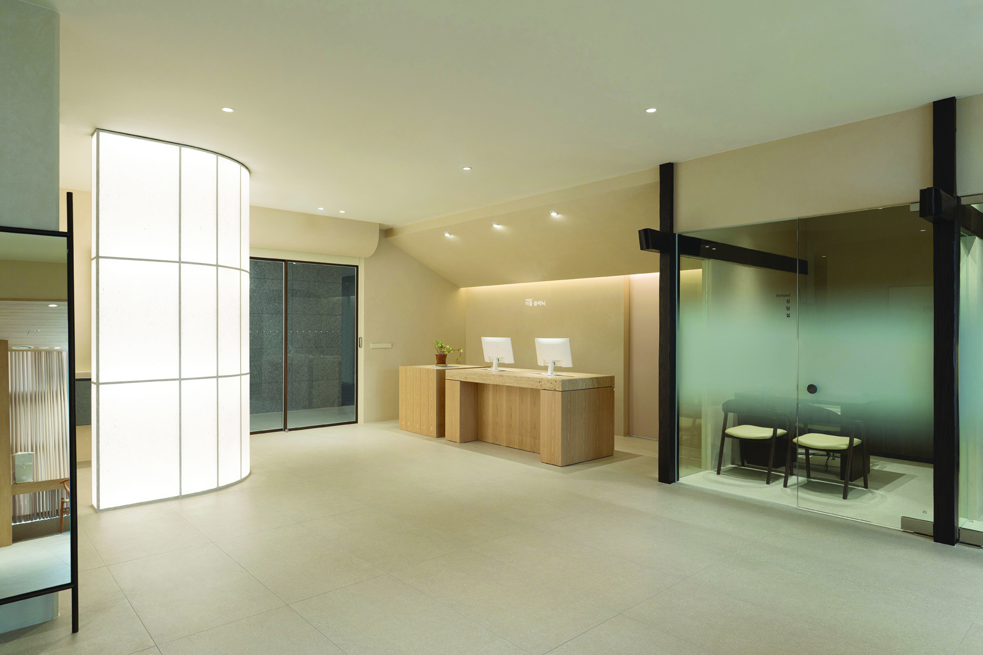 라운지는 길게 뻗은 우드 바 테이블이 중심을 이루며, 단순하지만 명확한 공간의 무드를 정제된 리듬으로 완성하였다. 오픈 선반장은 시각적인 무게감을 줄이며, 수납과 디스플레이의 기능을 유연하게 받아들인다. 이 두 요소는 라운지에 포인트를 주며, 전체 공간의 흐름을 부드럽고 자연스럽게 유지되도록 설계하였다. 상담실은 고재 기둥을 주요 요소로 전통 건축의 구조적 아름다움을 현대적으로 풀어낸 공간이다. 세월의 결이 살아 있는 고재 기둥은 공간의 축을 형성하며, 한국적 고요함을 연출한다. 동양화 속 안개를 연상하는 유리도어는 경계를 부드럽게 흐리는 방식으로 상담과 소통이 이뤄지는 공간에 부드러운 긴장감을 유지한다.