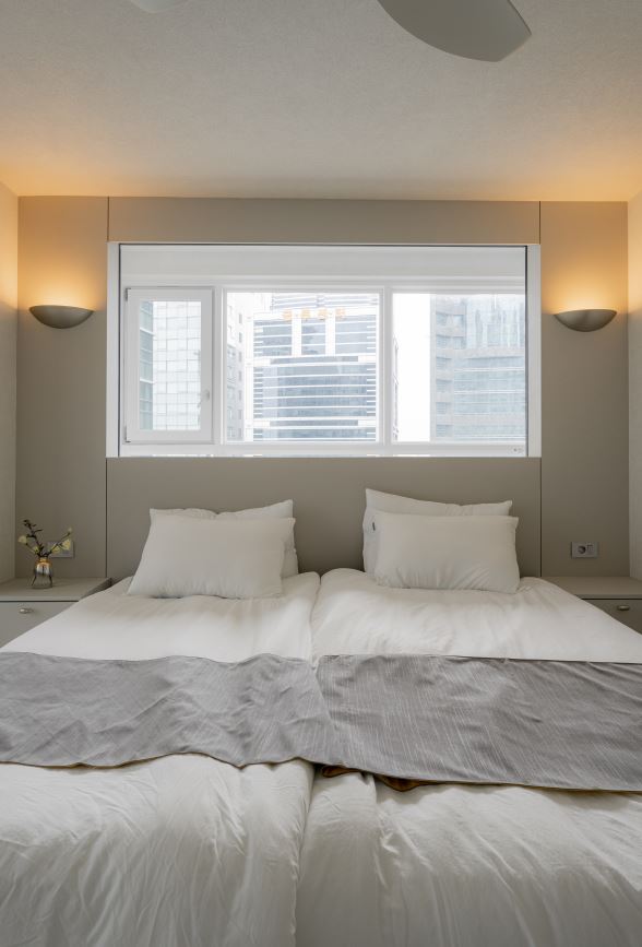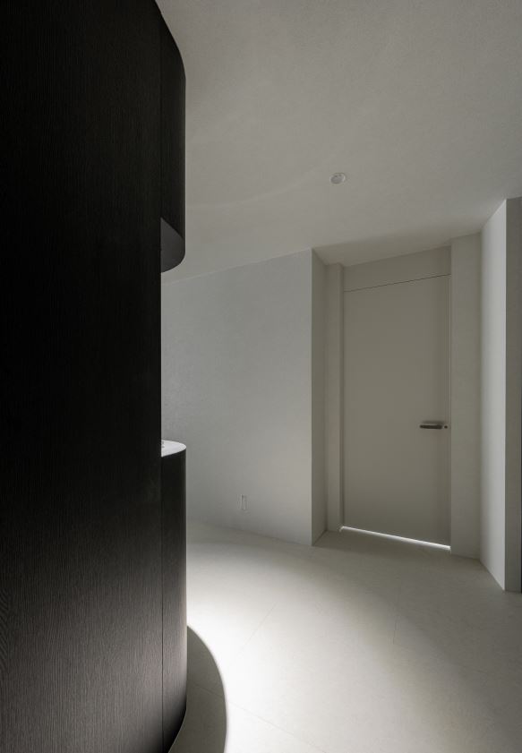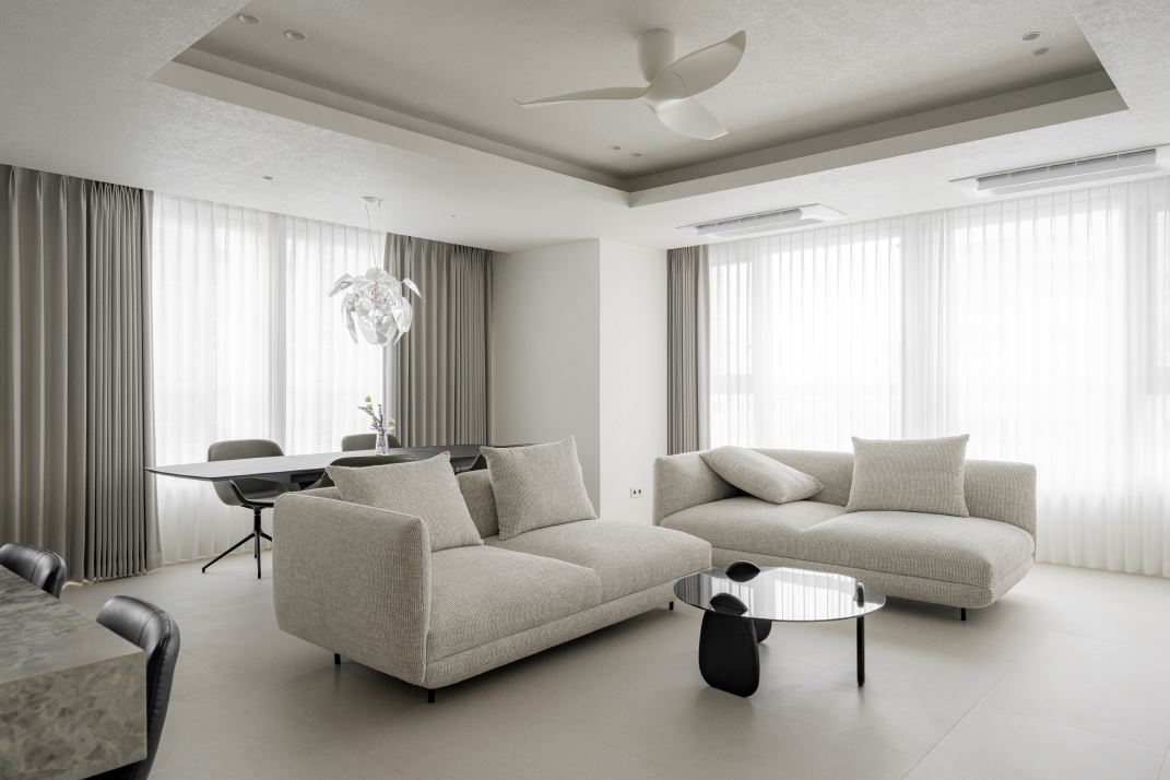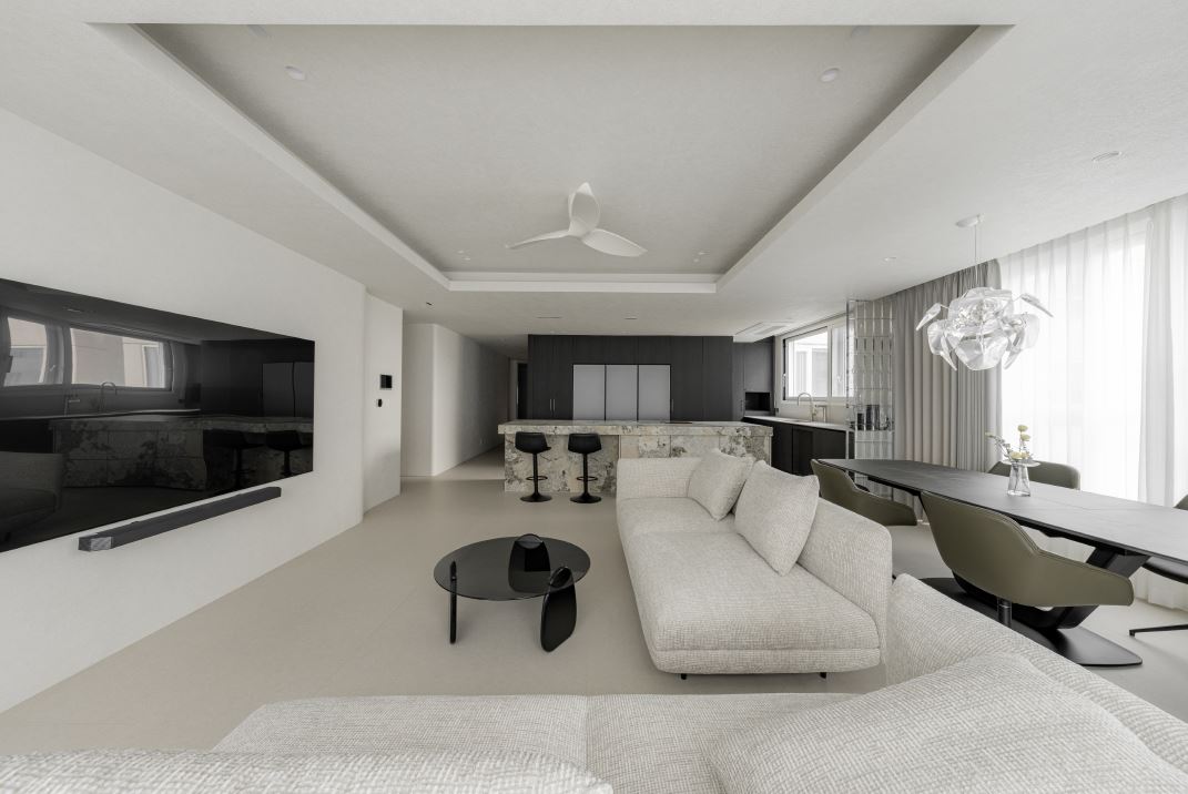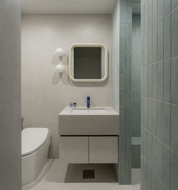 ©mingrapher클라이언트는 부부와 반려견 한 마리다. 이들은 도시적 절제와 실용성, 편안함을 원했다. 이에 스튜디오는 구조적 완성도와 감도의 조율에 집중해서, 거주자의 생활 리듬과 취향을 분석해 불필요한 벽과 동선을 정리했다. 현관은 수납을 양방향으로 확장한 뒤, 한편에 벤치를 배치하고, 바닥에는 천연석 패턴을 재현한 세라믹 타일을 시공했다. 분전함은 페이크 도어로 숨겨 시각적 노이즈를 제거하며 진입부를 차분한 분위기로 완성했다. 단조로운 복도는 '움직임이 느껴지는 선'으로 재해석해 모서리를 곡선으로 다듬고, 중간에 오브제 벽을 두어 시각적 여백을 더했다. 서재와 화장실 문은 위치를 재조정하고 포켓 도어로 교체해 간섭을 최소화했다. 거실 화장실은 블루 수전과 하늘색 무광 모자이크 타일로 클라이언트의 유쾌한 성향을 감각적으로 풀어냈으며, 세면대 선반 단차를 없애는 등 구조적으로도 개방감을 줬다.