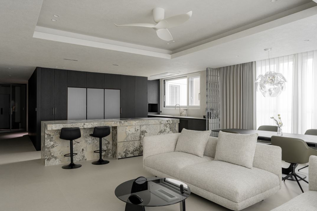 이번 프로젝트의 하이라이트는 단연 주방이다. 스튜디오는 기존 벽체를 철거해 시야와 동선을 동시에 확장했다. 주방 중심에는 프로젝트의 시그니처 요소인 이탈리아산 ‘파타고니아 와우 세라믹’ 아일랜드를 배치해 현관부터 콘셉트를 연결했다. 스튜디오는 ‘덩어리감과 볼륨의 균형’을 핵심으로 고려해 입구 벽면의 무게감에 중심을 두고, 이를 기준으로 아일랜드가 돋보이도록 블랙 톤을 배치해 공간 리듬을 설계했다. 공간 전반이 대리석과 세라믹, 메탈로 구조적 존재감을 드러내는 만큼, 조명은 가볍고 영롱한 루체플랜(Luceplan)의 팬던트로 무게감을 중화했다. 부드럽게 확산되는 빛은 균형감과 볼륨 대비를 시각적으로 완성하며 도시적 세련미의 정점을 이룬다.
