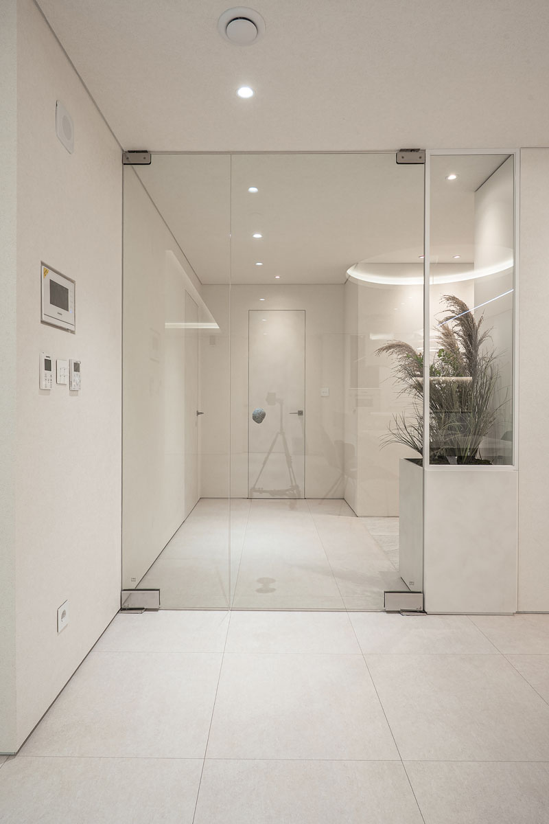 ©쇼픽 김진영제일풍경채는 빛과 여백, 그리고 동선에 의해 미니멀리즘을 완성한 리뉴얼 프로젝트다. 디자인엔진은 클라이언트의 생활방식에 따라 공간의 편의성과 효율성을 극대화하는 디자인을 기획하였고, 라이프스타일에 맞는 기능성 공간 배치를 구성하여 각 영역의 동선을 체계적인 디자인으로 설계하였다. 이에 밝고 깔끔한 선의 흐름 속에서 구조와 형태가 하나의 리듬을 이루는 공간디자인을 완성하였다. 입구는 '환대와 보호'라는 상반된 역할을 하나의 구조 안에서 조화롭게 구현하였다. 외부와 내부의 경계를 나누는 대신, 시선과 동선의 흐름을 디자인적으로 조율하여 거주자에게는 생활 리듬을 보 평면도 호하고, 방문객에게는 정돈된 환대의 경험을 제공한다.