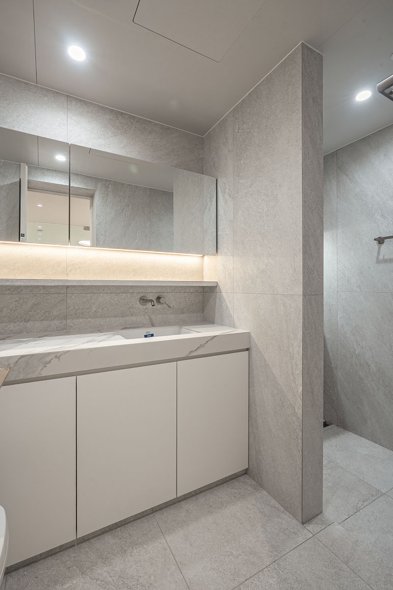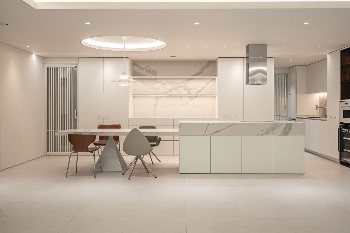 ©쇼픽 김진영주방과 다이닝, 거실은 자연스럽게 이어지는 오픈 플랜으로 디자인되었다. 하나의 흐름 안에 놓인 공간이지만 조리 영역은 시야에서 은은히 물러나 배치하였고, 거실은 언제나 정돈된 풍경을 유지하도록 설계하였다. 생활의 흔적은 보이지 않되, 삶의 온기는 고스란히 전해지는 구조다. 와이드한 아일랜드와 일체형 다이닝 테이블은 삼각형과 원형의 기하학적 비례를 응용해 제작되었는데, 특히 삼각형 테이블 다리는 바닥으로 시선을 자연스럽게 이끌며, 보다 넓고 안정적인 공간감을 형성한다. 미니멀리즘은 생활 속에서도 흐트러지지 않는 구조, 그 안에서 사용자의 마음까지 차분해질 때 비로소 완성된다. 디자인엔진은 공간의 기능을 넘어, 일상의 품격을 조용히 끌어올리는 리빙 공간을 완성하였다.