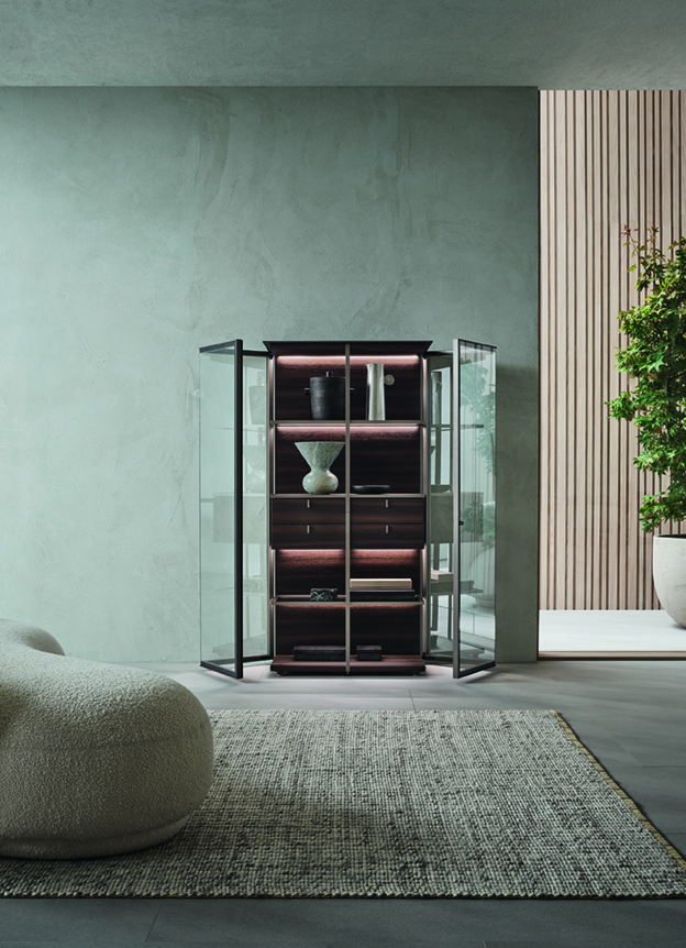 The glass showcase stands as a quiet yet solid presence, crafted to elevate its sculptural essence.