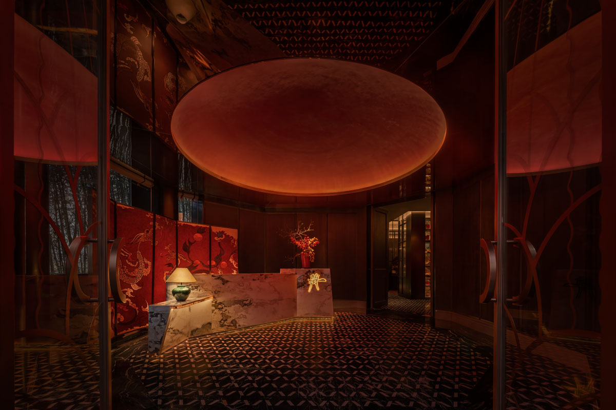 LDH 디자인은 전통적인 코트야드(courtyard) 개념을 실내에 재해석해 도입하며, 층위를 강조하는 순차적인 공간 구성을 완성하였다. 1층은 밝고 개방적인 분위기로 설계되어 메인 홀의 중심 역할을 수행하고, 붉은 옥빛의 원형 계단을 따라 올라가는 2층은 친밀함과 개방감이 공존하는 반 프라이빗 다이닝 존으로 이어진다. 대칭적인 레이아웃과 원형 계단은 방문객이 외부에서 중간 영역을 거쳐 내부로 자연스럽게 이동하도록 유도하며, 공간의 흐름에 명확한 질서를 부여한다.
