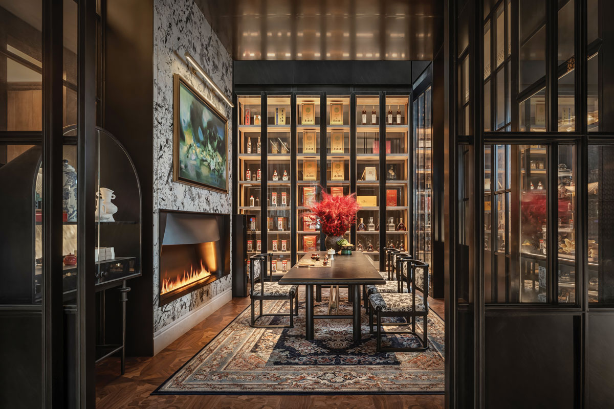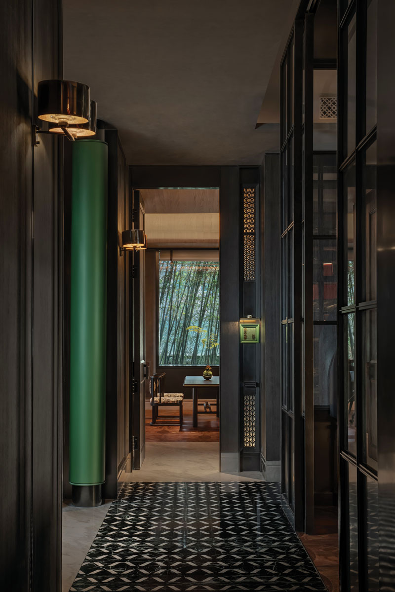 LDH 디자인은 전통적인 코트야드(courtyard) 개념을 실내에 재해석해 도입하며, 층위를 강조하는 순차적인 공간 구성을 완성하였다. 1층은 밝고 개방적인 분위기로 설계되어 메인 홀의 중심 역할을 수행하고, 붉은 옥빛의 원형 계단을 따라 올라가는 2층은 친밀함과 개방감이 공존하는 반 프라이빗 다이닝 존으로 이어진다. 대칭적인 레이아웃과 원형 계단은 방문객이 외부에서 중간 영역을 거쳐 내부로 자연스럽게 이동하도록 유도하며, 공간의 흐름에 명확한 질서를 부여한다.