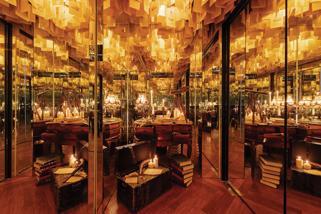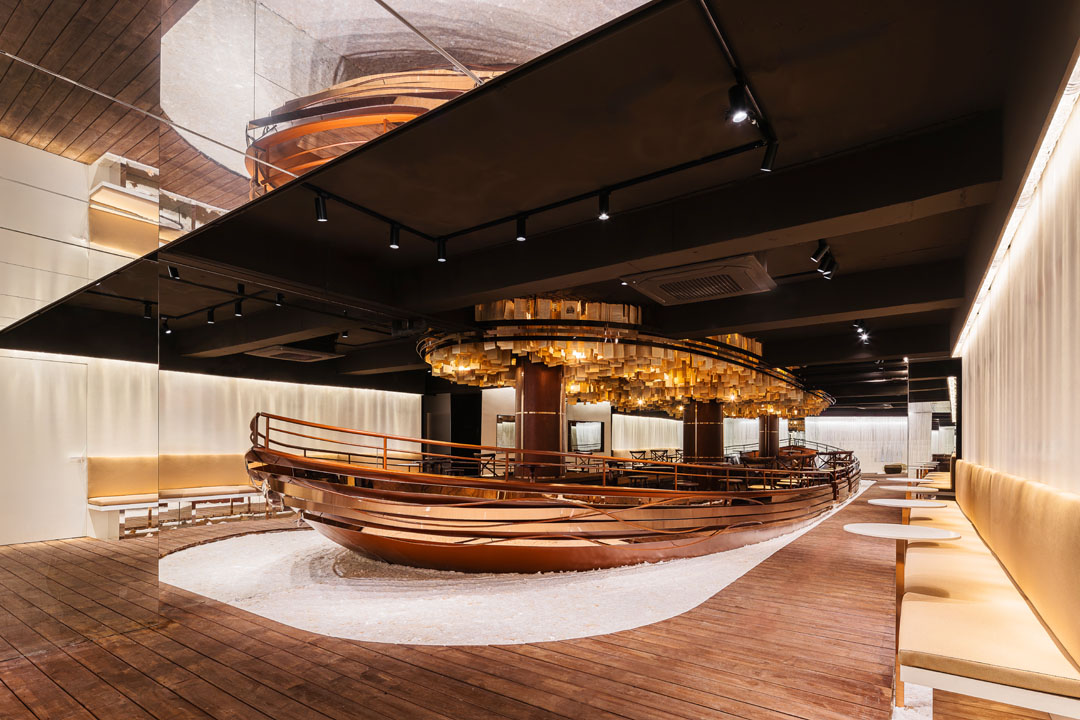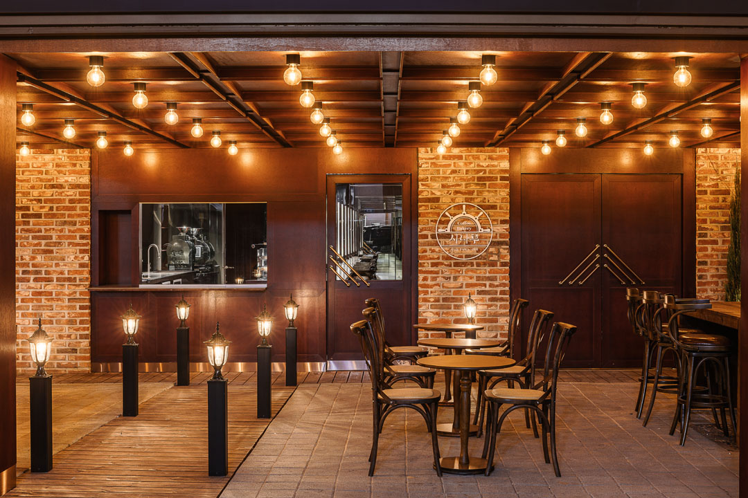 공간 디자인을 맡은 스페이스닷(SPACE DOT)은 선박이 드나들던 나루터를 핵심 콘셉트로 설정하고, 개항 시대의 색감과 분위기, 디테일을 담되 현재의 시점에서 새롭고 비현실적인 공간 경험으로 풀어냈다. 입구는 과거 나루터로 향하던 길이자 화려한 매표소를 연상시키도록 구성되었다. 1층은 나루터의 매표소를 모티프로 한 공간으로, 주문을 마친 방문객은 배의 키를 형상화한 문 손잡이가 달린 문을 열고 시간을 초월하듯 여행자의 공간에 들어선다.