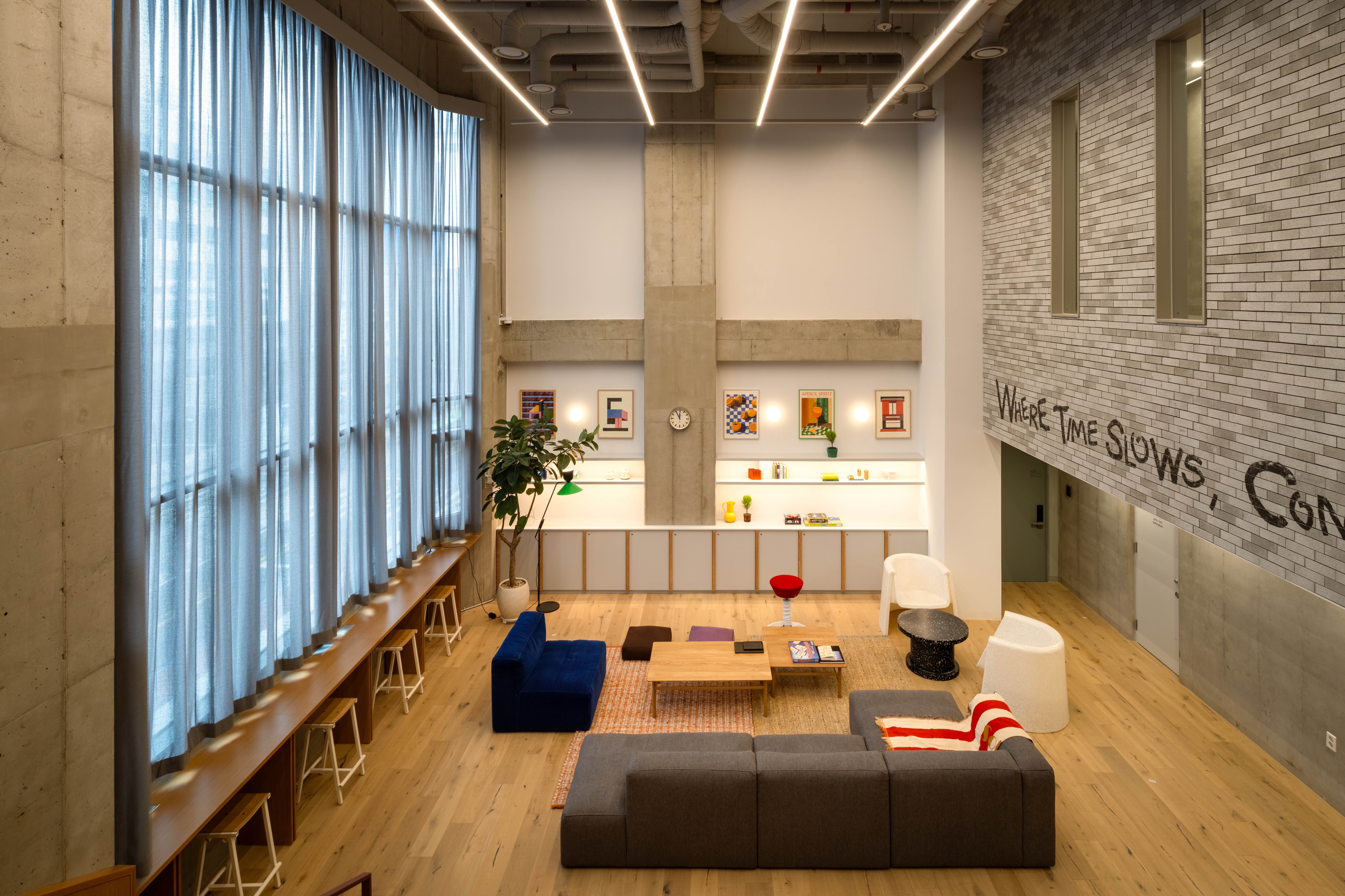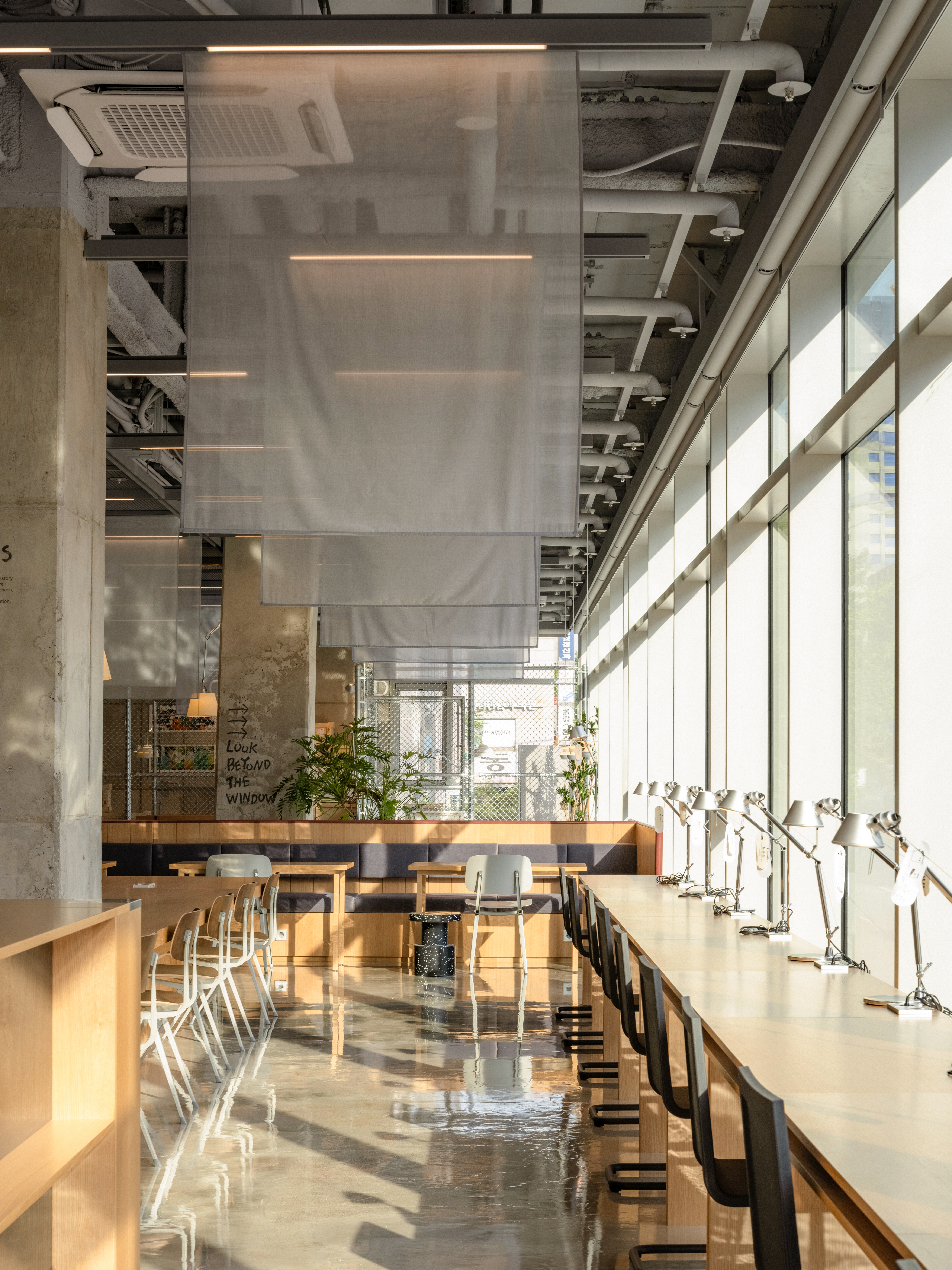 건물 고층에 위치한 쿠킹 라운지는 통창을 통해 세브란스병원과 뒤편 안산까지의 탁 트인 조망을 제공한다. 신촌 중심부라는 입지를 적극 활용해, 도시 경관과 어우러지는 동시에 시야를 열어주는 공간적 특장점도 살렸다. 라운지는 기능성에 초점을 맞춰 구성했다. 쿠킹룸과 다이닝 테이블을 분리했고, 쿠킹룸은 전문 오픈형 스튜디오처럼 유리로 독립된 공간을 구성했다. 아이보리와 블랙 톤의 차분하고 절제된 인테리어는 공간의 완성도를 높인다.