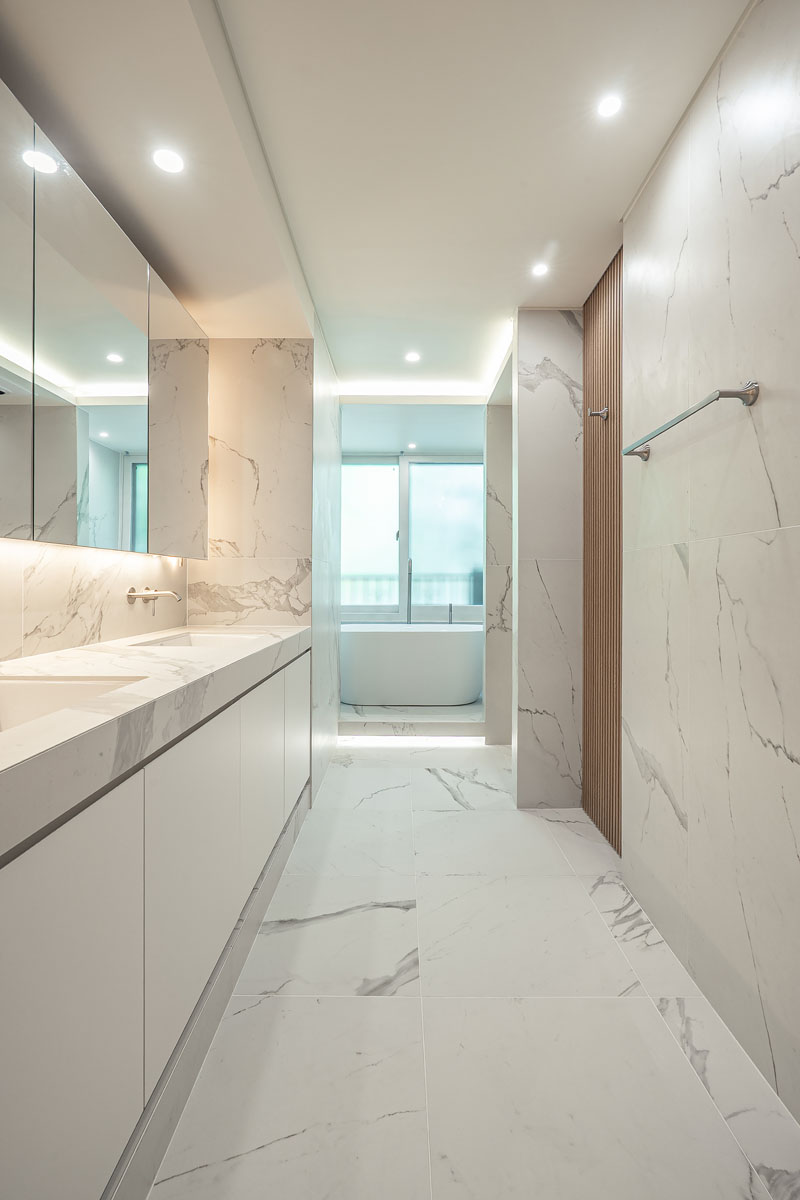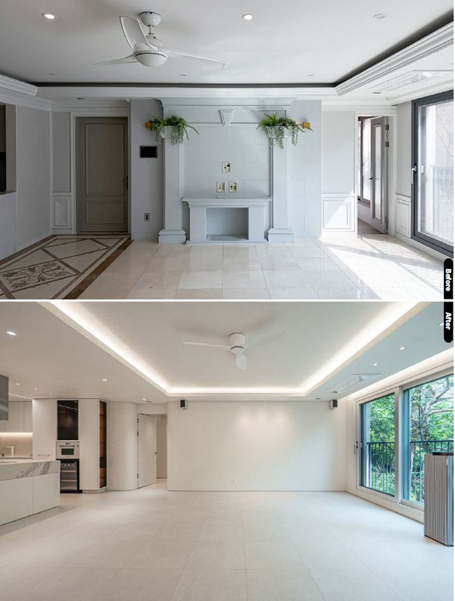 ©쇼픽 김진영제일풍경채는 빛과 여백, 그리고 동선에 의해 미니멀리즘을 완성한 리뉴얼 프로젝트다. 디자인엔진은 클라이언트의 생활방식에 따라 공간의 편의성과 효율성을 극대화하는 디자인을 기획하였고, 라이프스타일에 맞는 기능성 공간 배치를 구성하여 각 영역의 동선을 체계적인 디자인으로 설계하였다. 이에 밝고 깔끔한 선의 흐름 속에서 구조와 형태가 하나의 리듬을 이루는 공간디자인을 완성하였다. 입구는 '환대와 보호'라는 상반된 역할을 하나의 구조 안에서 조화롭게 구현하였다. 외부와 내부의 경계를 나누는 대신, 시선과 동선의 흐름을 디자인적으로 조율하여 거주자에게는 생활 리듬을 보 평면도 호하고, 방문객에게는 정돈된 환대의 경험을 제공한다.