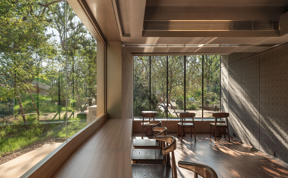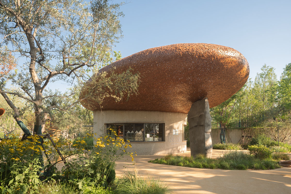 ©SFAPA UFO-shaped dessert station with a cantilevered metal canopy serves as a striking visual landmark and directional cue. Adjacent feed barns and wash facilities, capped with bamboo and metal roofs, emphasize sculptural lightness. Stone and metal entrances lead to interiors finished with cement-based artisan coatings and textured tiles, creating a refined yet tactile atmosphere.