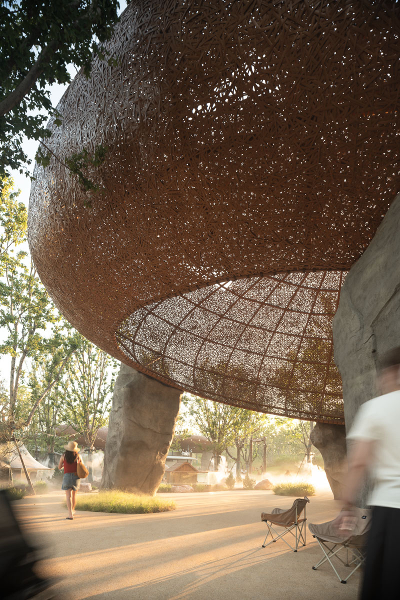 ©SFAP건축물을 이루는 자재와 직조 공법은 자연물의 연장선상이라는 흐름과 기능적 건축물 사이의 균형을 이루도록 계획되었다. 크리에이티브 워크숍을 비롯한 주요 건물의 지붕은 지속 가능한 대나무 직조 구조로 설계되어 가볍고 메시(mesh) 특유의 투명성을 드러낸다. 직조된 돔과 돌처럼 형상화된 기둥은 주변 동식물과 어우러지며, 인공 구조물이 자연 풍경의 일부로 인식되는 장면을 만들어낸다. 특히, 대나무 돔의 삼각형 컷아웃은 역동적인 빛과 그림자 패턴을 형성해, 공간에 리드미컬한 시각적 변화를 부여한다.