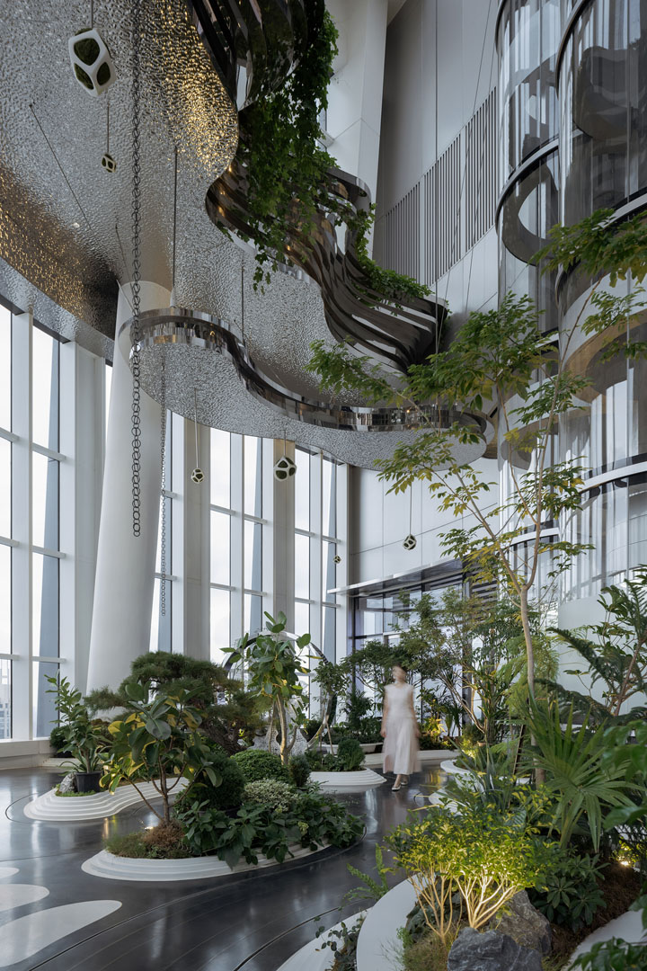 건축가는 연속된 흰색 아치 구조를 활용해, 소규모 공간이 주를 이루는 56층을 하나의 연속적인 빙산 동굴로 구성했다. 55층에는 복층 높이의 전망 카페와 컨벤션 홀이 배치되어 공간적 구성을 풍요롭게 했다. 56에서 반복되는 흰색 아치형 볼트가 자칫 단조로워질 수 있다는 점을 고려해, 건축가는 스피커, 카메라, 스프링클러, 조명, 환기구 등 각종 설비를 컴퓨테이셔널 패터닝(computational patterning) 기법으로 하나의 패턴 안에 통합했다.