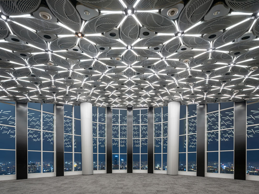 Using a sequence of white arches, the architect shapes Level 56—dominated by smaller rooms—into a continuous iceberg-like cavern, while Level 55 introduces a double-height observation café and convention hall to enrich the spatial composition. To prevent monotony, building systems such as lighting, sprinklers, speakers, and ventilation are integrated into a single pattern through computational patterning.
