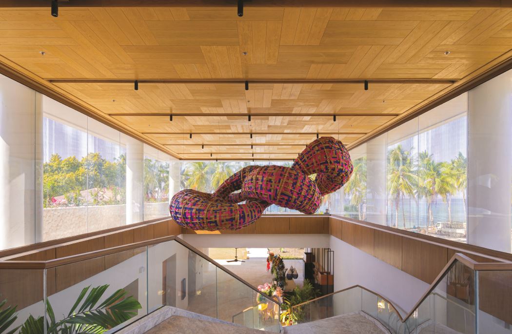 A dramatic installation is suspended above the staircase that links the two levels—a sculptural statement that channels a distinct craft sensibility. EPA’s approach for this project was deeply rooted in the traditions of Bohol Island. By collaborating closely with local artisans, they introduced genuine materials and time-honored techniques, allowing the region’s cultural texture to inform the design in meaningful ways. The sweeping curves of the form are driven purely by sculptural intent. Between bundles of pale ochre rattan, vivid bands of pink and blue are woven through—offering a nod to traditional motifs while integrating effortlessly into the contemporary interior.