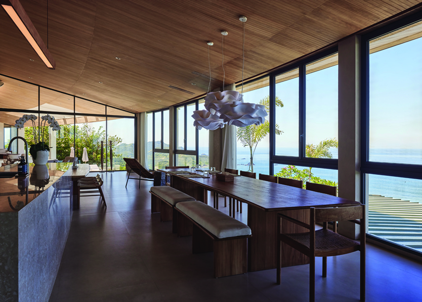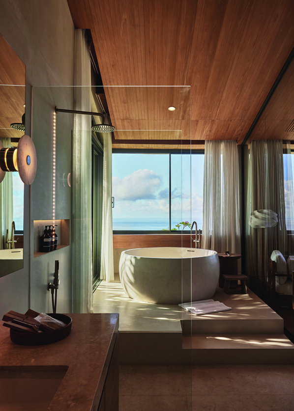 ©KieThe private living and sleeping quarters are designed to feel both serene and refined. Large windows frame the surrounding landscape, while angled openings below enhance the sense of openness and connection to nature. A consistent material palette—extending from the bathtub and vanity to the walls—emphasizes visual clarity, while recessed curtain rails maintain a seamless, uncluttered look. From a distance, Villa Boë reads as a composition of concentric segments carefully placed along the ridge, offering a sculptural presence from every angle. Each architectural gesture is intentional, shaped by Alexis Dornier’s precise and thoughtful approach. This is a building that doesn’t seek to dominate the landscape, but rather holds its ground with quiet clarity and purpose.