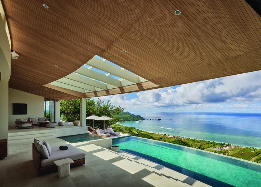 Villa Boë는 인도네시아 롬복(Lombok)에 있는 탐파 힐스(Tampah Hills)의 가장 높은 부지에 위치해 있다. 이번 프로젝트는 가파른 지형 자체가 설계 과정 전반에 깊게 개입한 경우다. 각 공간을 수직으로 쌓아 올라가는 방식이 도입된 Boë는 일반적인 건축물이라기보다 지형과 하나된 ‘대지미술(land art)’에 가까워 보인다. 평면 구성은 언덕 꼭대기를 중심으로 동심원과 방사형 세그먼트를 기본으로 하며, 이 기하학적 구조는 지붕 양식과 건물 전체의 구조를 결정한다. 이로 인해 건축물의 테라스는 마치 연속적인 계단식 지형으로 인식된다.