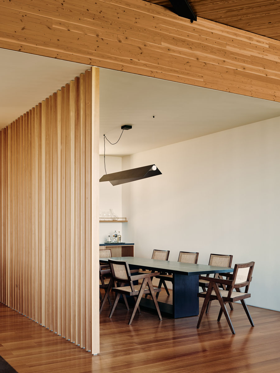 The primary suites on the upper level extend across the slope on cantilevered volumes, quietly hovering above the landscape. Set on a 12,500 m² site, the house offers panoramic views stretching from the adjacent Stanford University campus to the expanse of San Francisco Bay. The residence achieves a balance between its expansive presence and moments of calm and enclosure. Nestled beneath oaks, the guest house expands more intimately upward toward the bay through its canopy, enhancing the spatial layering of the interiors.