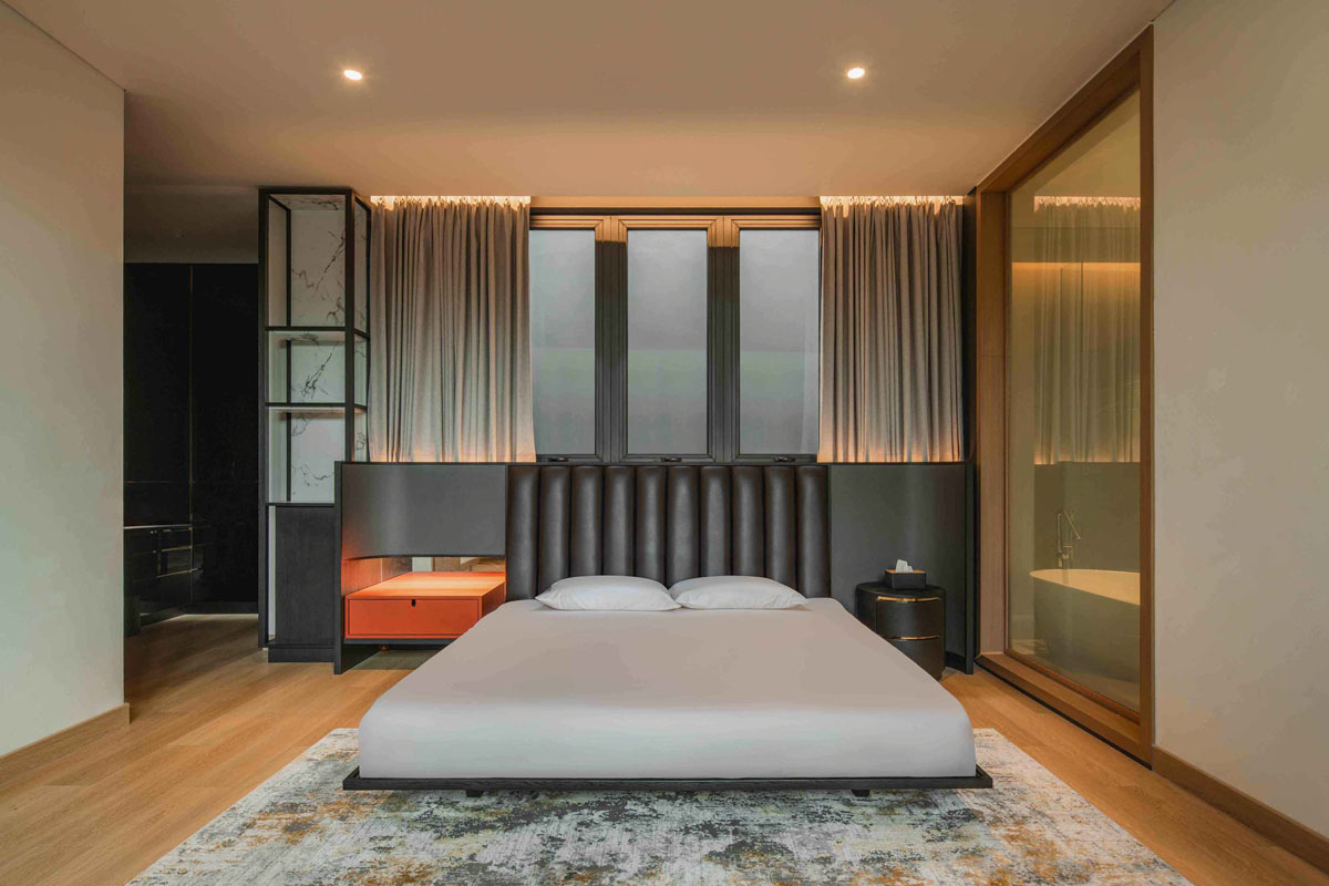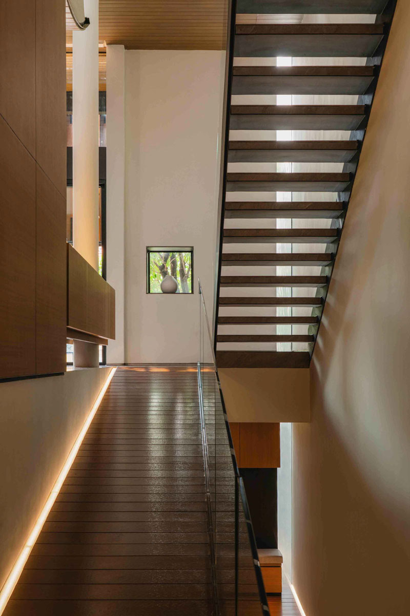상부 층에는 침실과 공용 공간을 배치하고, 중앙 계단으로 스플릿 레벨 구조를 연결함으로써 시각적, 공간적 연속성을 확보하고, 사적 영역과 공동 영역 사이의 균형을 확립했다. 또한 인도네시아의 덥고 습한 기후를 고려해 앞마당과 뒷마당을 완충공간으로 설정, 직접적인 열기 유입을 줄이고 건물의 교차 환기 성능을 높이고자 했다. 지붕에 배치된 천창은 자연 채광을 충분히 유입시키며, 공간 구조상 층별 공기 순환을 촉진한다. 앞마당 위의 루버는 직사광선을 차단하면서 프라이버시를 보호하며, 우드톤의 마감은 외벽, 지붕, 조경과 어우러져 건물 전체의 인상을 따뜻하고 부드럽게 조율한다.