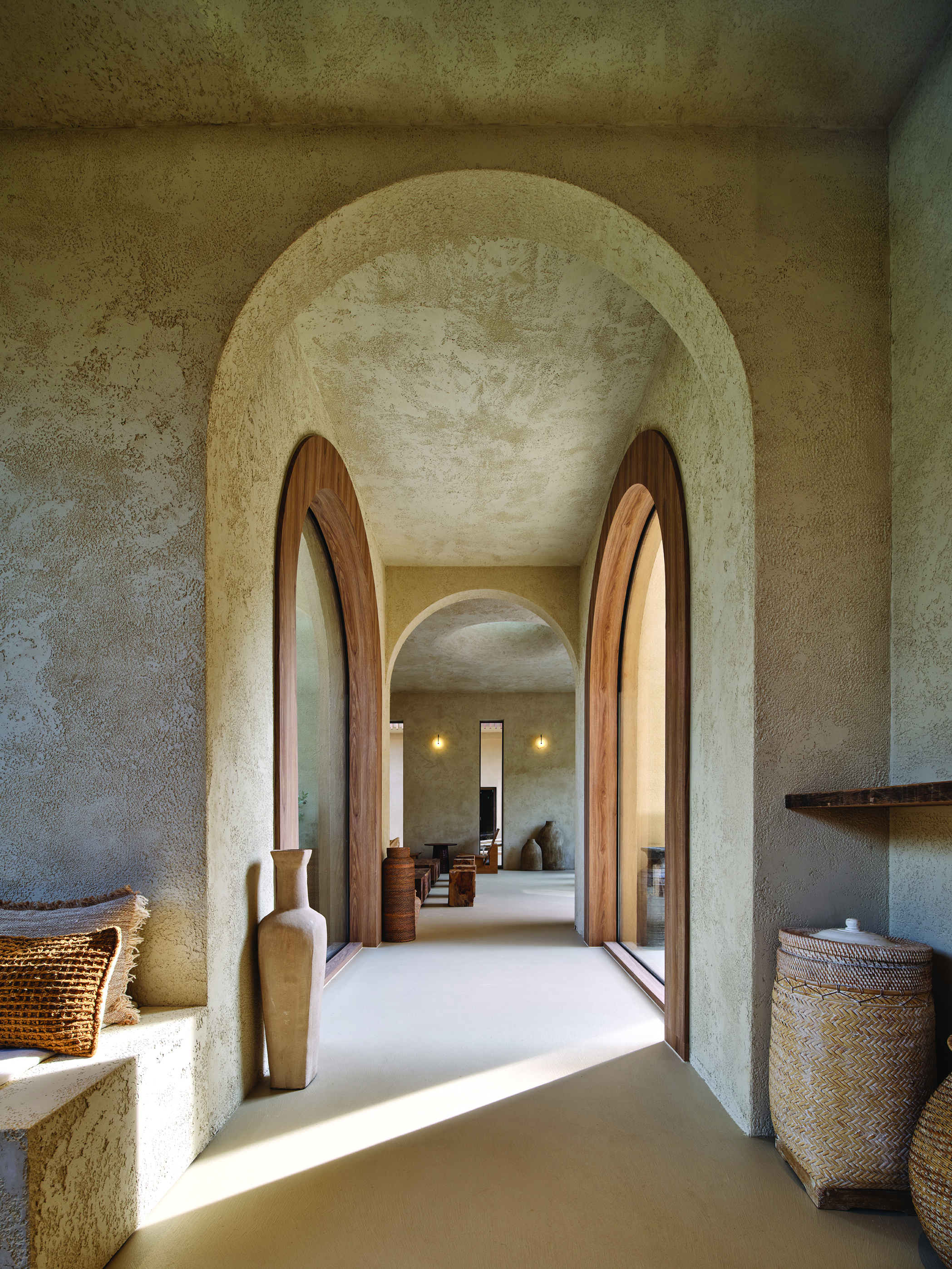 카페와 연결된 브릿지동으로 이동하면 아치형 양식으로 설계된 공간이 드러난다. 브릿지동은 복층 카페와 웜홀동을 연결하는 중간지점에 위치하며, 건물과 건물 사이에 골목을 형성해 머무름과 이동 사이 감정적 완충 공간으로 작동한다. 긴 복도 내부에는 한쪽 벽면을 따라 길게 이어지는 수직창과, 반대편의 넓은 창이 시시각각 변하는 자연광과 바람으로 다채로운 공간 경험을 제공한다. 이어지는 웜홀동은 빛과 어둠, 개방과 폐쇄의 경계를 유연하게 넘나드는 공간으로 기획되었다. 내부는 하나의 큰 볼륨 속에서 벽과 천장이 곡선으로 이어지며, 시선의 깊이와 공간의 밀도를 조절하도록 설계되었다. 낮에는 상부 개구부를 통해 자연광이 깊게 스며들고, 밤에는 벽면의 간접 조명으로 시간대에 따라 상반된 분위기가 연출된다. 벽면에는 자연스러운 사막의 질감을 표현하기 위해 스타코플렉스의 텍스처를 활용했다.