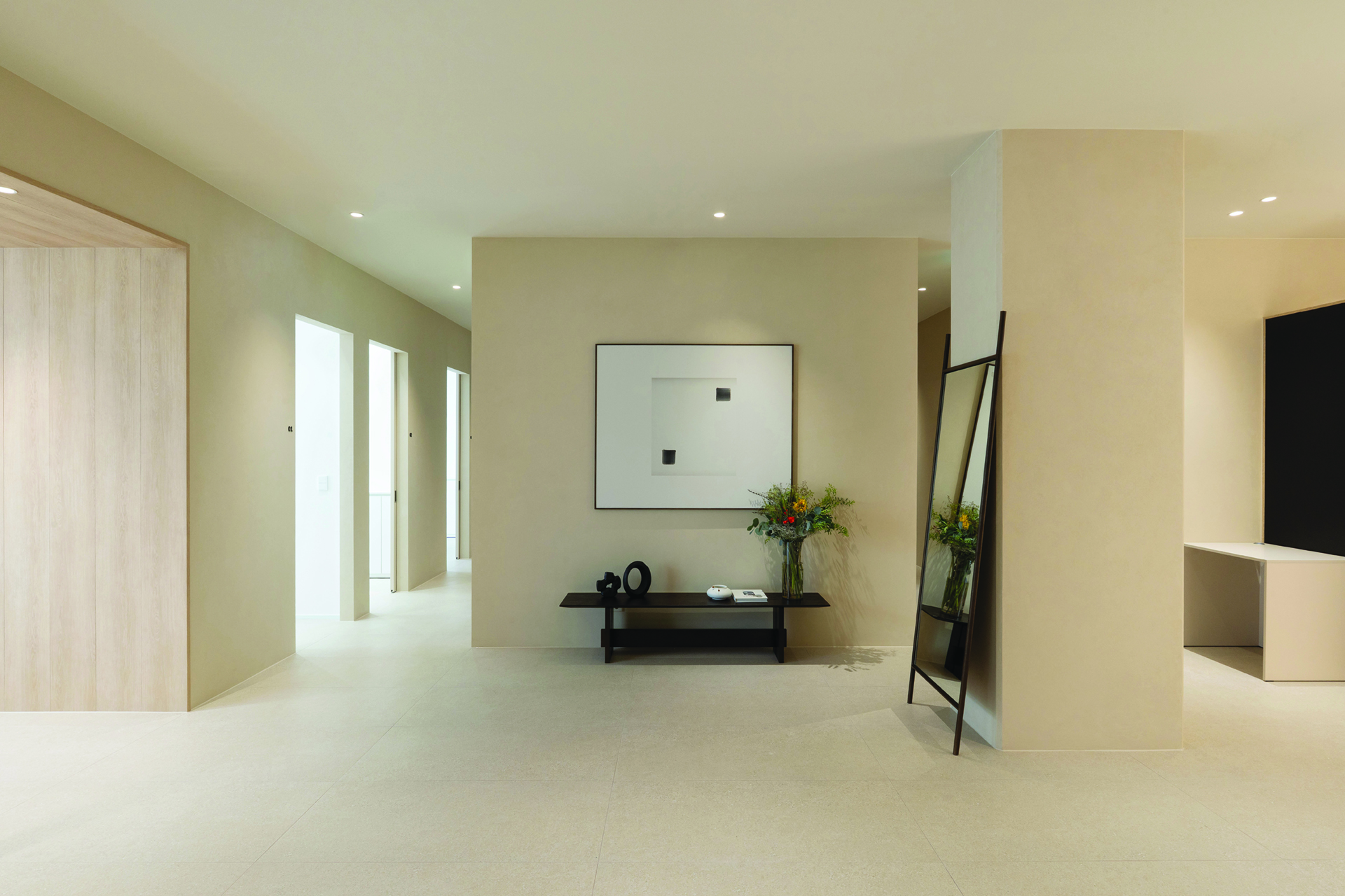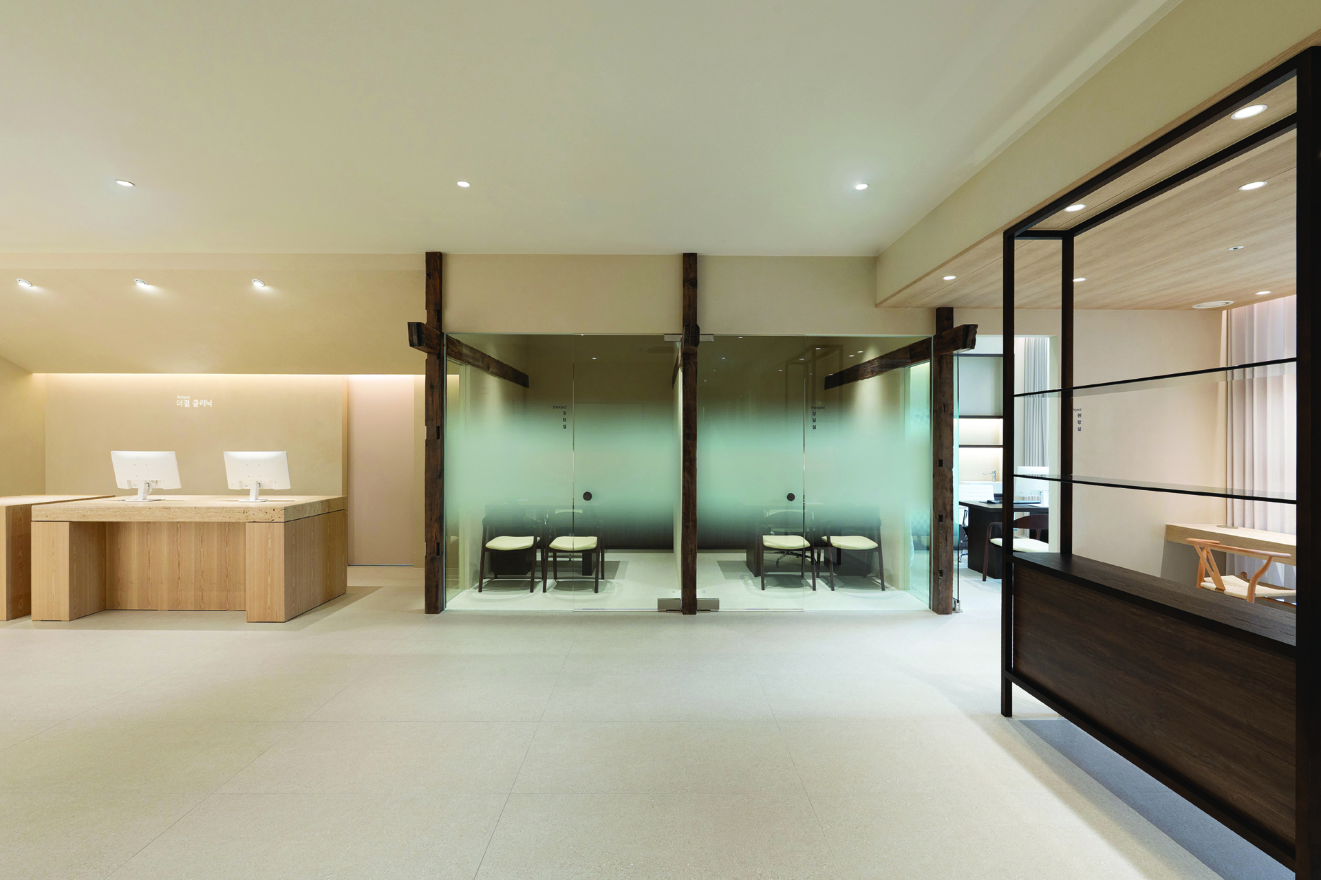 라운지는 길게 뻗은 우드 바 테이블이 중심을 이루며, 단순하지만 명확한 공간의 무드를 정제된 리듬으로 완성하였다. 오픈 선반장은 시각적인 무게감을 줄이며, 수납과 디스플레이의 기능을 유연하게 받아들인다. 이 두 요소는 라운지에 포인트를 주며, 전체 공간의 흐름을 부드럽고 자연스럽게 유지되도록 설계하였다. 상담실은 고재 기둥을 주요 요소로 전통 건축의 구조적 아름다움을 현대적으로 풀어낸 공간이다. 세월의 결이 살아 있는 고재 기둥은 공간의 축을 형성하며, 한국적 고요함을 연출한다. 동양화 속 안개를 연상하는 유리도어는 경계를 부드럽게 흐리는 방식으로 상담과 소통이 이뤄지는 공간에 부드러운 긴장감을 유지한다.