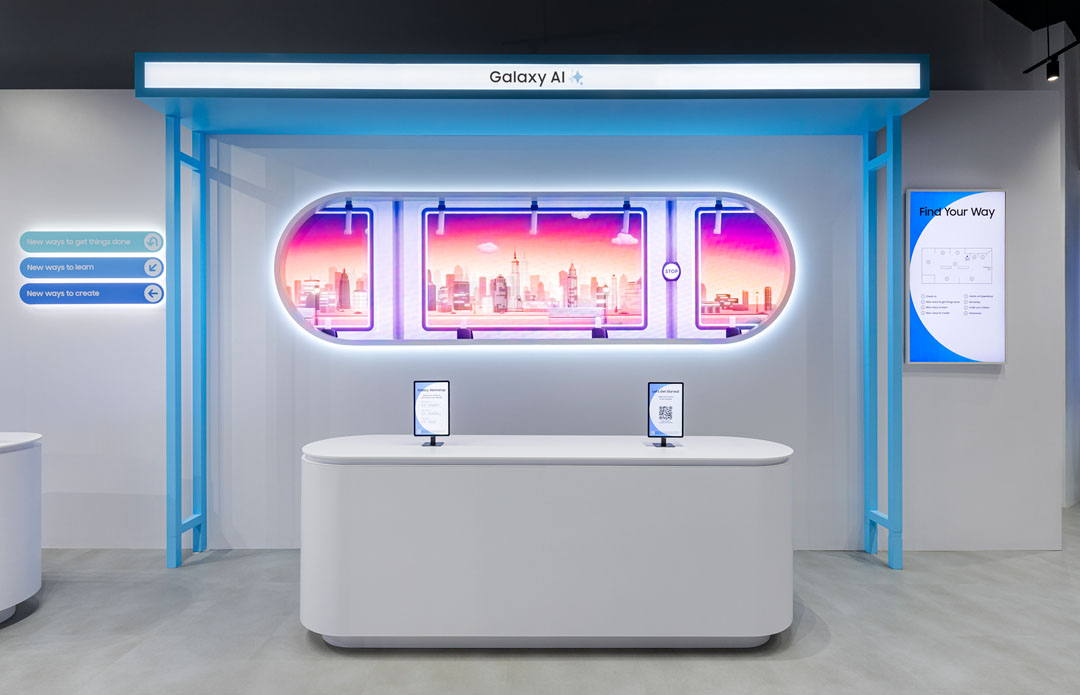 공간디자인은 'Get things done', 'Learn', 'Create’로 이어지는 일상의 대표적인 상태를 중심으로 구성되었다. 이에 고객은 공간을 거닐며 하루의 흐름과 일상의 장면을 자연스럽게 체험할 수 있다. 일정, 이동, 학습, 창작 등 일상 속 다양한 상황에 따라 유연하게 변화하는 Now bar의 특성은 곧 사용자의 일상을 구성하는 순간들과 맞닿아 있다. 체험 공간은 버스 정류장을 닮은 체크인 카운터에서 시작되며, ‘New ways to Get things done’, ‘New ways to Learn’, ‘New ways to Create’로 이어지는 세 가지 AI 체험 공간으로 이어진다. 이에 라이프스타일, 학습, 창작 등 일상의 다양한 순간 속 Galaxy AI 기능을 직접 경험할 수 있도록 구성하였으며, 각 공간은 집, 도서관, 포토존을 연상시키는 환경으로 연출되어 체험의 몰입도를 높인다.