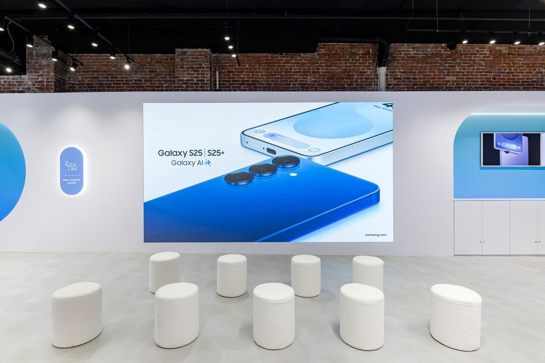 Galaxy Experience Space는 Now bar를 중심으로 일상 속 AI 경험을 공간으로 풀어낸 팝업으로, 고객이 공간을 거닐며 확장된 일상과 더욱 편리해진 S25 시리즈의 사용성을 자연스럽게 경험할 수 있도록 설계되었다. 사용자의 하루 흐름 속에서 필요한 정보를 그 순간에 맞춰 제안하는 UI Now bar는 단순하고 명확한 둥근 형태의 공간으로 설계되었다. 특히 세 가지 AI 체험 공간의 벽면을 Now bar 형태의 움푹 들어간 구조로 설계해 공간 전체의 아이덴티티를 형성함과 동시에 각 체험 영역을 명확히 구분하였다. 벽면 내부에는 하루의 시간 흐름을 담은 그라데이션을 적용해 변화하는 일상을 시각적으로 표현하였다. 가구와 디테일 또한 곡선 위주의 형태로 통일하여 UI와 공간 경험 간의 일관성을 강화하였다.