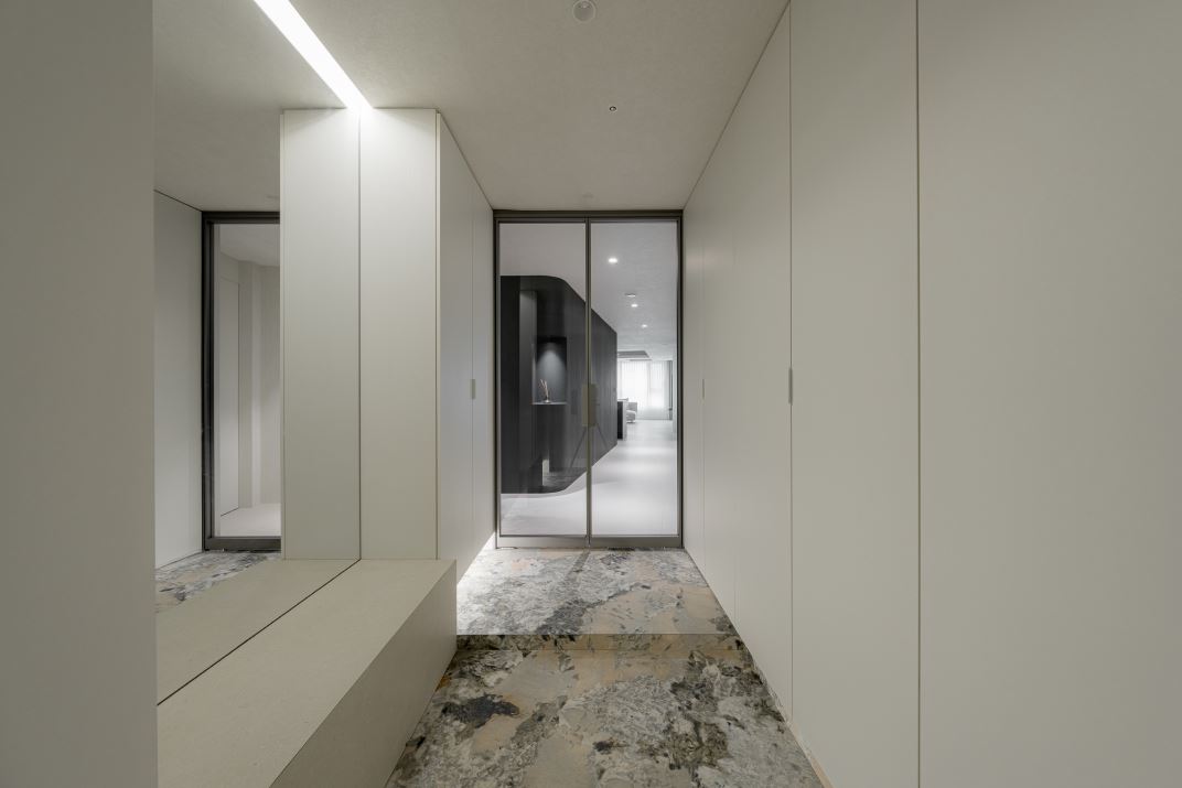 이번 프로젝트의 하이라이트는 단연 주방이다. 스튜디오는 기존 벽체를 철거해 시야와 동선을 동시에 확장했다. 주방 중심에는 프로젝트의 시그니처 요소인 이탈리아산 ‘파타고니아 와우 세라믹’ 아일랜드를 배치해 현관부터 콘셉트를 연결했다. 스튜디오는 ‘덩어리감과 볼륨의 균형’을 핵심으로 고려해 입구 벽면의 무게감에 중심을 두고, 이를 기준으로 아일랜드가 돋보이도록 블랙 톤을 배치해 공간 리듬을 설계했다. 공간 전반이 대리석과 세라믹, 메탈로 구조적 존재감을 드러내는 만큼, 조명은 가볍고 영롱한 루체플랜(Luceplan)의 팬던트로 무게감을 중화했다. 부드럽게 확산되는 빛은 균형감과 볼륨 대비를 시각적으로 완성하며 도시적 세련미의 정점을 이룬다.