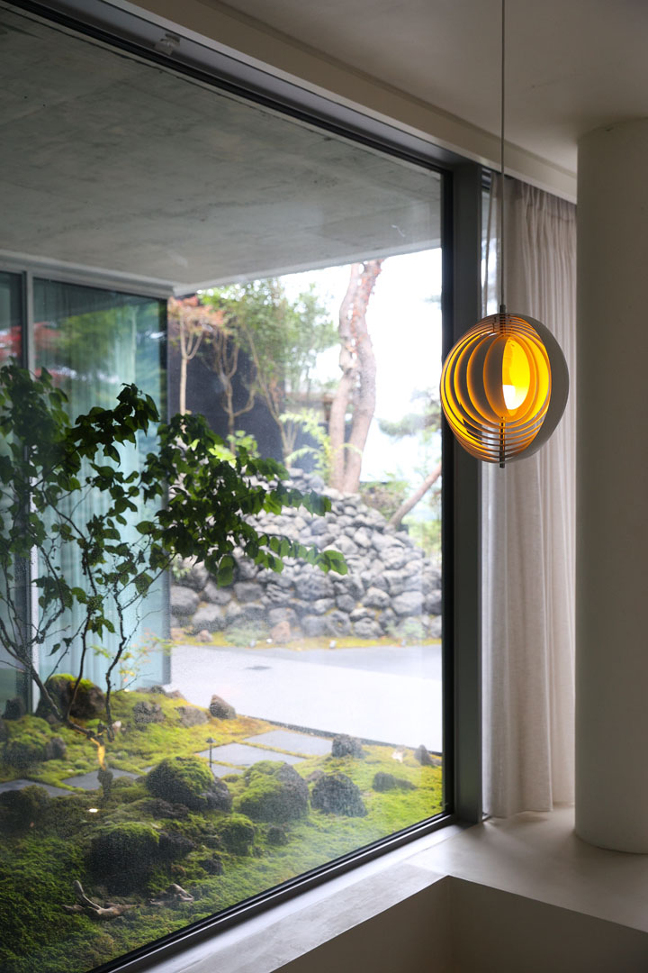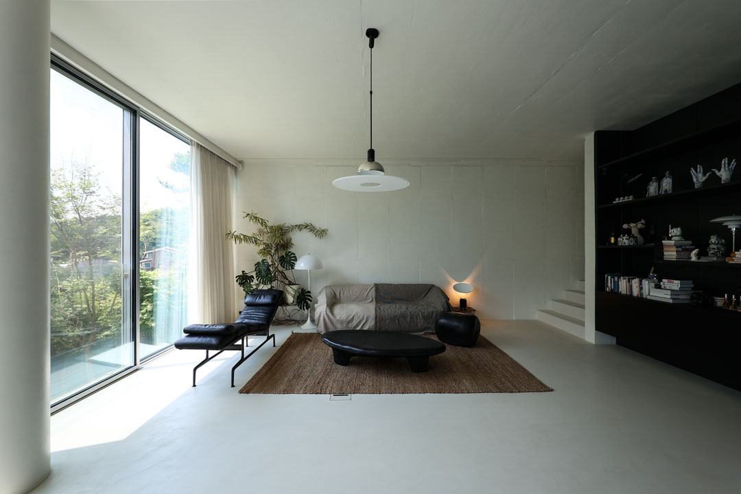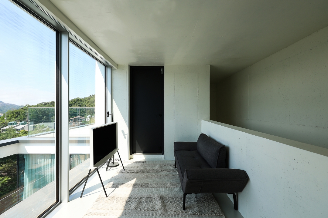 이에 건축가는 최대 면적을 확보하기 위해 단순한 형태의 건물을 계획했다. 남측 서울 전망 방향의 입면은 전면을 개방형 창으로 구성한 반면, 북측 도로 방면에는 최소한의 창만 두어 프라이버시를 확보했다. 그 결과 지하층 역시 전면 유리창 너머로 기획된 조경이 한눈에 들어오도록 구현되었다.