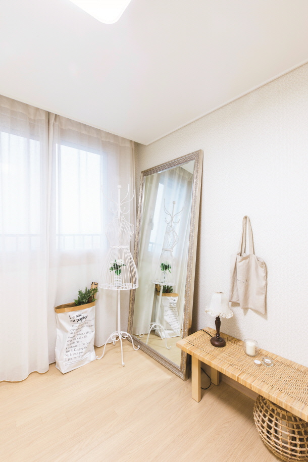 드레스룸 가장 작은 방은 옷을 편하게 갈아 입을 수 있는 드레스룸이 되었다. 이 드레스룸에는 독특한 소품이 있는데, 바로 마네킹이다. 이 마네킹은 디자인 소품의 역할을 하면서 동시에 옷을 걸 수 있는 생활 소품으로서도 기능한다.