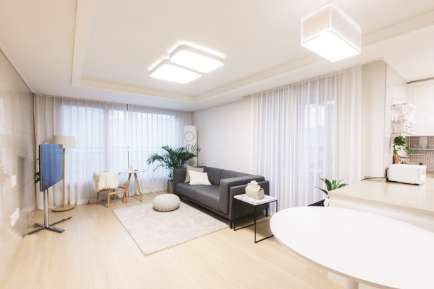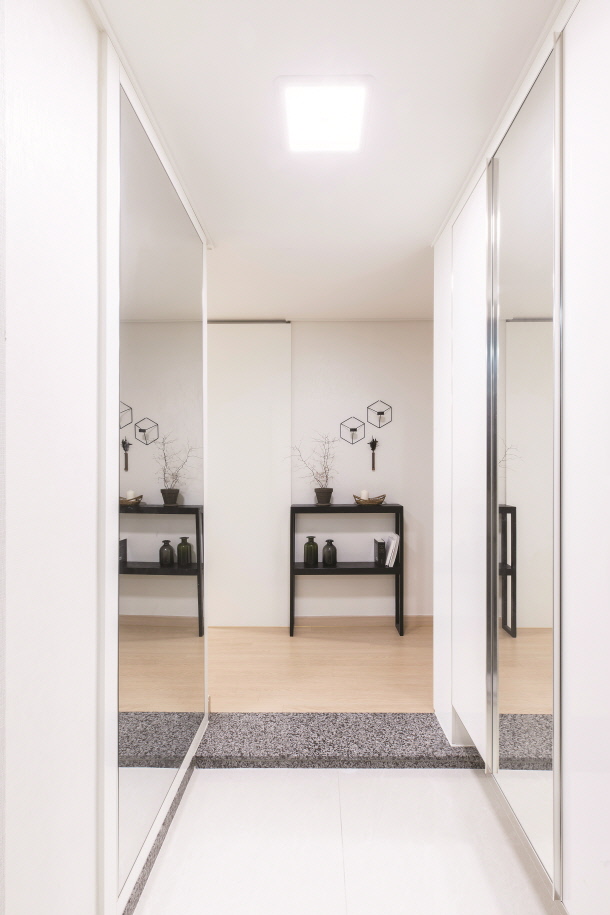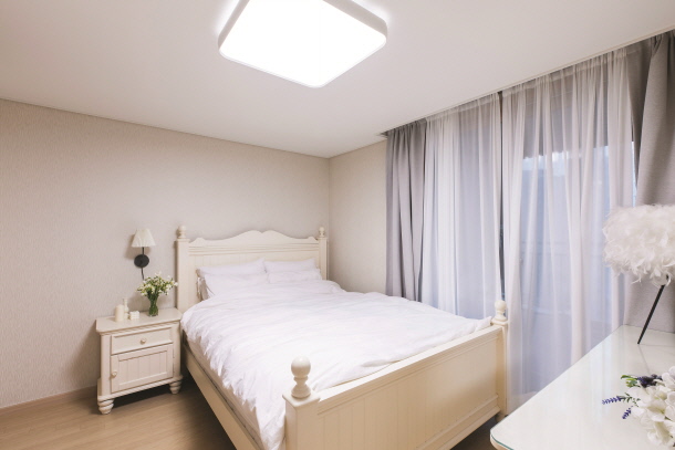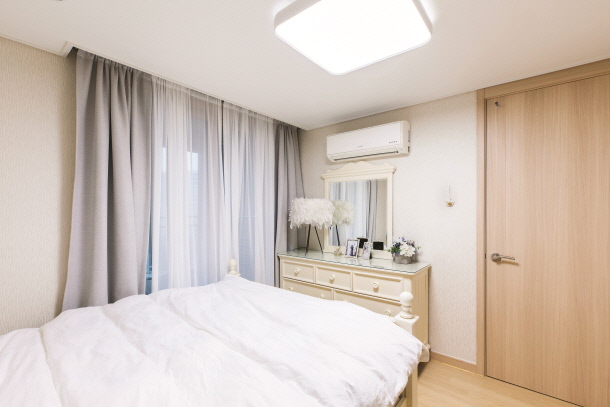 안방 숙면을 위한 공간으로, 침대와 작은 협탁, 화장대를 제외한 가구는 일체 들이지 않았다. 화이트 베이스 컬러의 컨셉으로 삼았다.