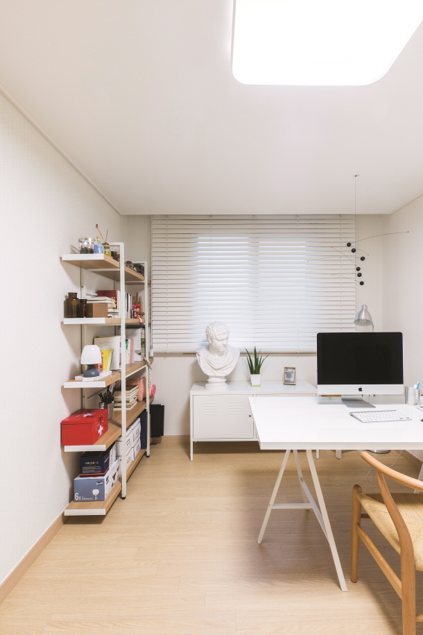 작업실 책상과 책꽂이, 수납장 하나로 단촐하게 이루어진 공간이지만, 시각적으로 심심한 공간이라 할 수는 없다. 독특한 디자인의 모빌과 그가 미술을 전공했단 걸 알 수 있는 두상이 훌륭한 소품이 되어 주었다.