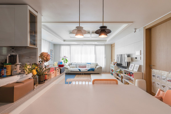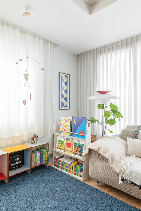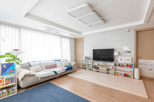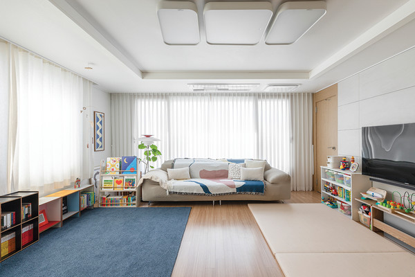 거실 화이트톤의 벽과 천장은 짙은 파란색 러그와 자연스러운 조화를 이룬다. 아이의 눈높이에 맞는 낮은 책장에는 알록달록한 책과 장난감이 담겨있어, 아기자기한 느낌을 준다.