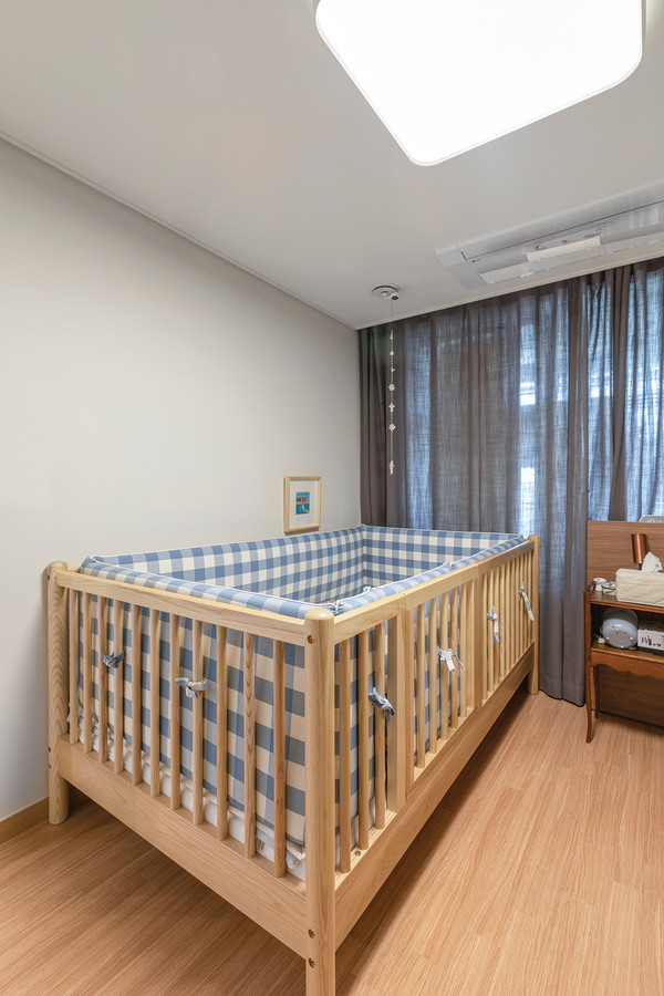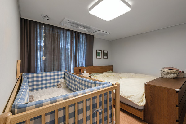 침실 수면을 온전하게 취할 수 있는 공간으로, 아이와의 휴식이 우선시 되었다. 그림이 담긴 작은 액자로 포인트를 주었으며, 액자 틀의 색상은 침실의 목제 가구와 매치된다. 아이 침대의 블루 체크는 차분한 분위기의 침실에 활력을 불어넣어 준다.