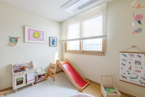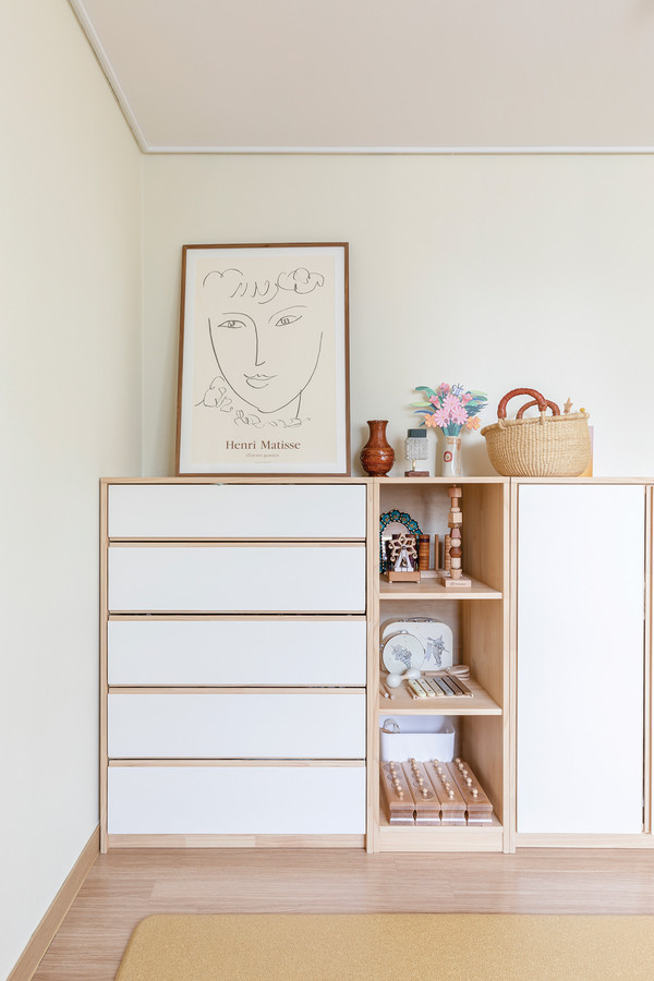 아이 방 전체적으로 베이지톤인 아이 방은 깔끔한 분위기에서 마티스의 그림으로 포인트를 주었다. 색감이 다양한 모빌 또한 포인트가 되어주며, 직접 만든 수공예품이 벽에 걸려있다.