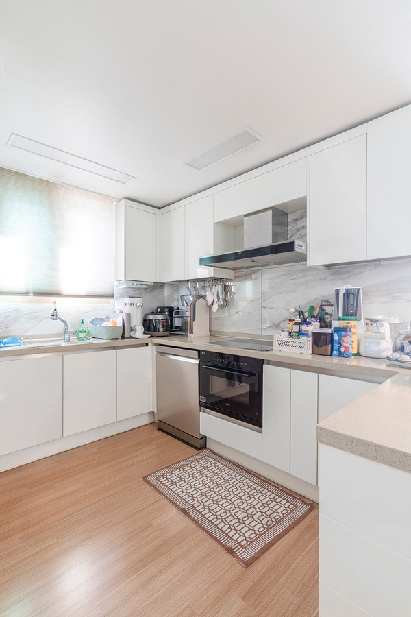 주방 테이블 위에는 화이트톤의 주방과 어우러지는 모노톤의 조명이 배치되어 차분한 분위기를 준다. 테이블의 의자는 형태와 색상을 달리해 단조롭지 않은 분위기를 연출했다.